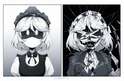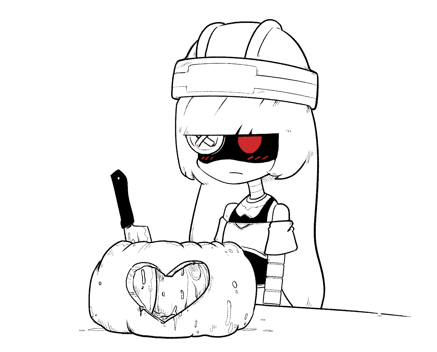>>299589 (me) Also, since I was laying it out for monochrome lineart, all that describing left out the teal eyes (both in her visoe and the organic ones)