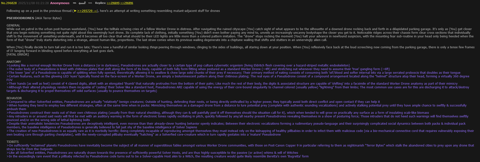 >Anglers >When a zombie drone dies around enough Solver biomass, it sometimes merges with it and becomes an Angler >Anglers use the biomass around them to create fake humans based on the memories of the drone that they previously were >These range from obvious fakes that will only fool someone at a distance under poor light, to near-perfect recreations of people, only detectable by in-depth scans or picking apart their memories and revealing the truth to them >They try to lead humans or drones to the Angler, where they're harvested for biomass/oil, the smarter ones believing that it's a safe place that contains survivors or supplies their quarry might want >Fake humans rarely resort to violence and will instead cower, begging to be spared >One notable exception: advanced fakes, if they learn what they are, will often turn to violence against the Angler that birthed them >When dealing with simple fake humans, simply kill them and mark the location they were found >Advanced fakes, if identified, should be convinced of their existence and given ordnance (a grenade or incendiary device) so they can kill their Angler >Fakes are linked to the Angler and will die with it, regardless of distance
