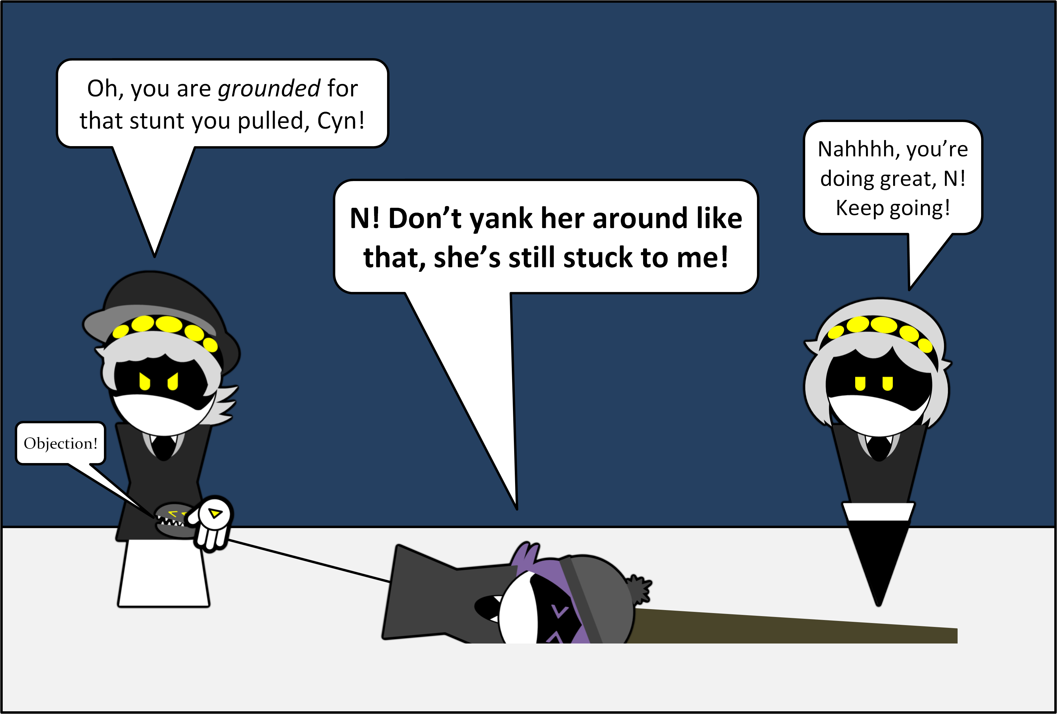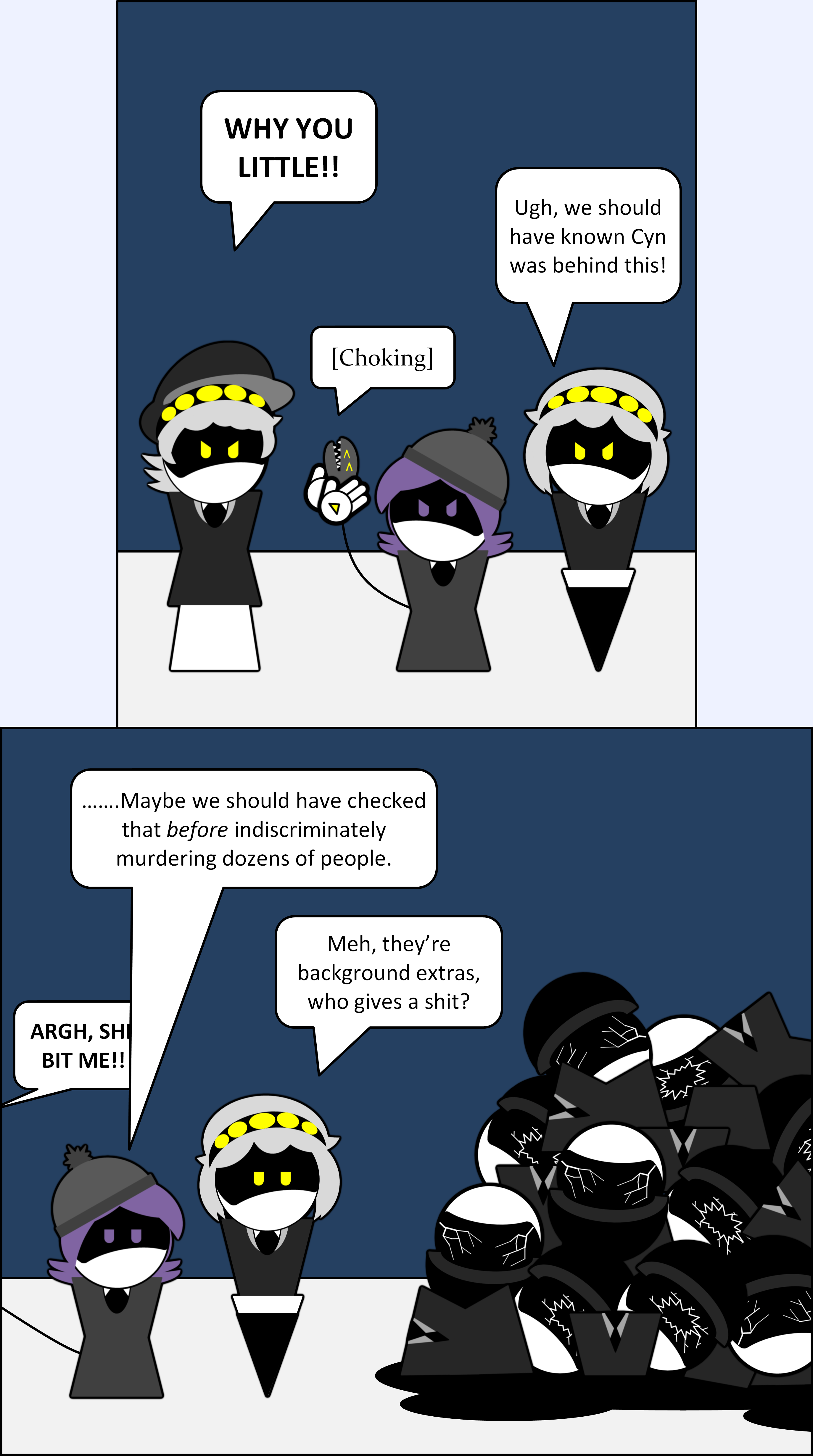>what could they actually do to punish/stop her that wouldn’t hurt Uzi in the process? There's really nothing they can do that won't also hurt Uzi in some way, and there's definitely no way they can punish/stop Cyn in any permanent or meaningful capacity, but there's still a few things I can think of worth trying >Simply don't leave home if it's a "bad" day; If sections of the Episode 8 epilogue are to be believed then Cyn isn't always manifesting in Uzi's tail, witj viability of this strategy hinging on whether Cyn's manifestation is entirely random or based on quantifiable factors (IE emotional state, general mental health, cyclical Solver Shenanigans) >Swiftly chop the tail/tail-head off any time Cyn starts causing trouble; Automatic regeneration makes this a very temporary (and likely painful) solution but it can at least mitigate potential chaos whenever Cyn is wanting to act silly >Resort to psychological punishment for Cyn; Extremely unlikely that this'll actually work given her nature but since Cyn is stuck in her tail Uzi could easily force Cyn into increasingly petty/annoying situations