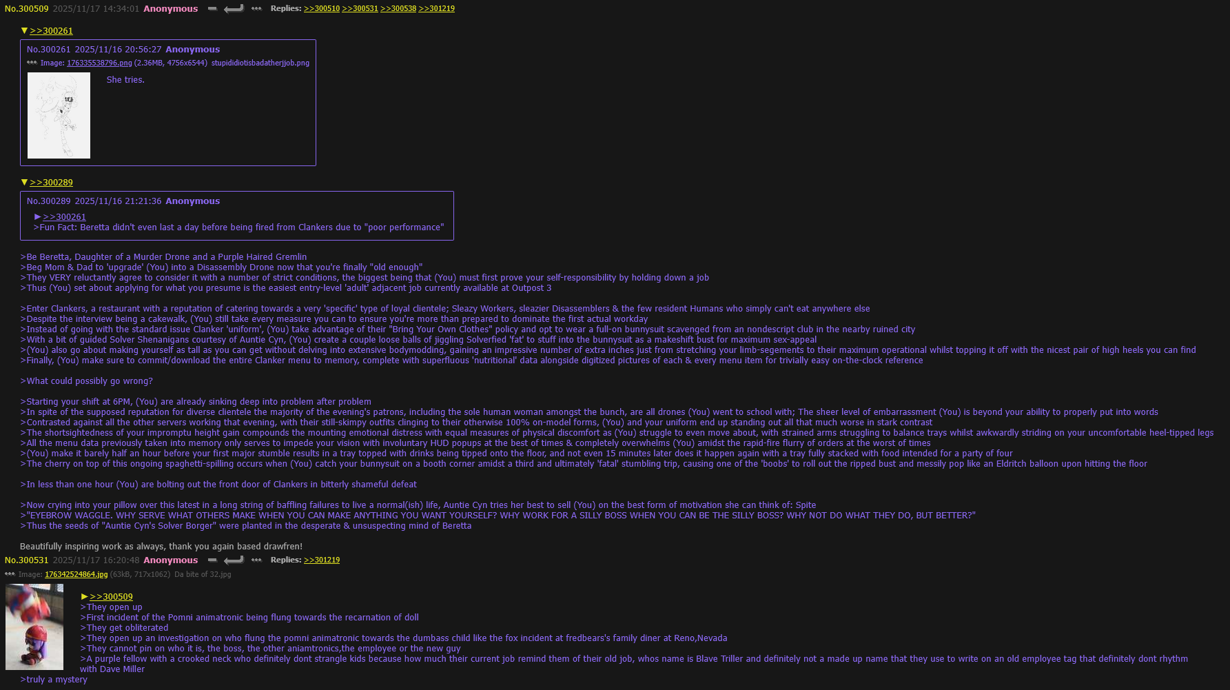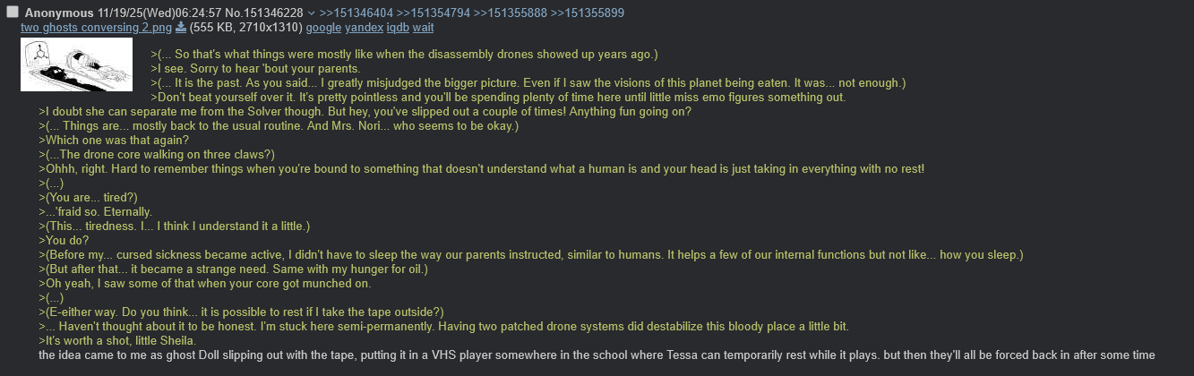 >>301832 >When the Solver War began, the Hourglass’ labs became one of the early centers of researching the Absolute Solver. >The results were not successful at all and all the lab workers down there did a very big fuckup. What it is, nobody knows, but it spread through the water which annihilated most of the human population on Trapest-4. Those that did survive fled the planet. >The Worker Drones, abandoned by their former masters, started to organise themselves into societies inspired by their masters now that they’re alone. For a while, everything went great until the Murder Drones made landfall here. >The WD population started getting thinned out one by one but they fought back. Many of the WDs retreated into the deep desert where life is harsh even for them but at least they’re mostly safe from Murder Drones. >The Murder Drones here believe that, thanks to Cyn’s false information, that they’re here to reclaim the planet back for JCJenson. However, Cyn believes that the failed experiments in the Hourglass, now roaming the skyscraper will pose a threat to her silly little plans so she keeps sending squads one after the other to exterminate what’s inside. >None of them came back and nobody knows what’s inside. >The skyscraper became a place of legend feared by both WDs and MDs. Anyone who goes there through the subterranean tunnels connecting it to the shore or flying never comes back. From adventurous WDs looking for expensive things or arrogant MDs, they all disappear without a trace.
