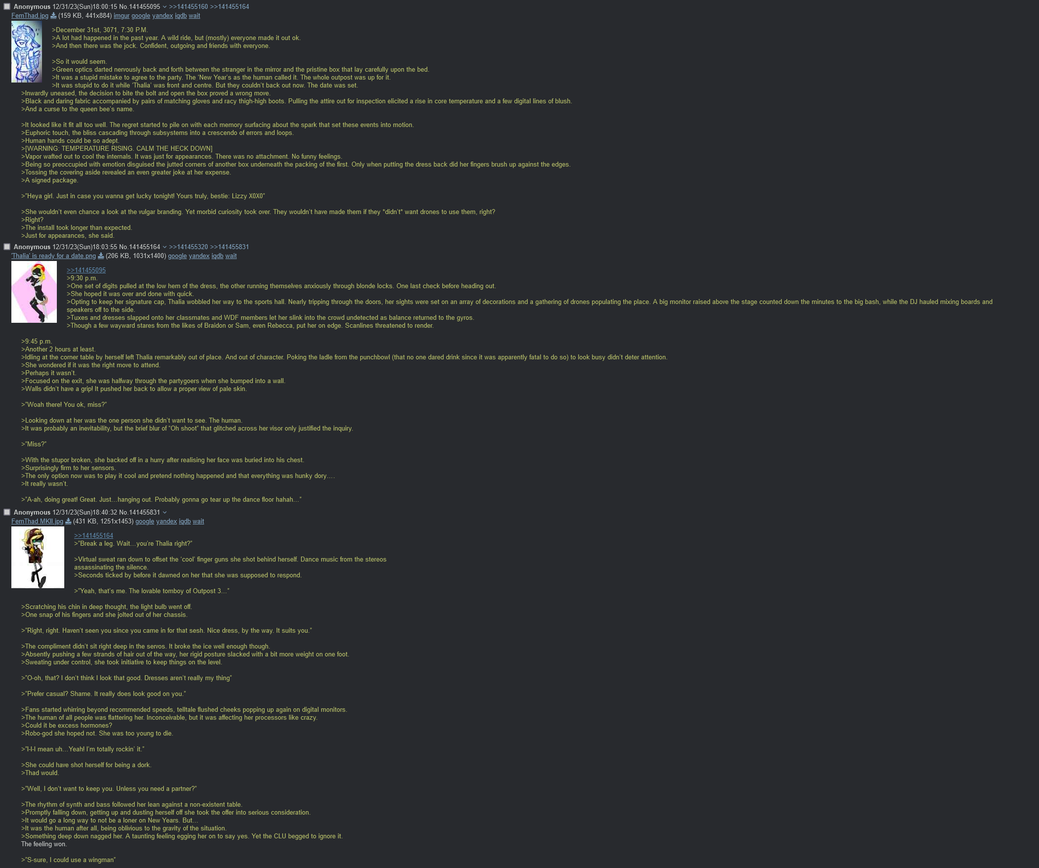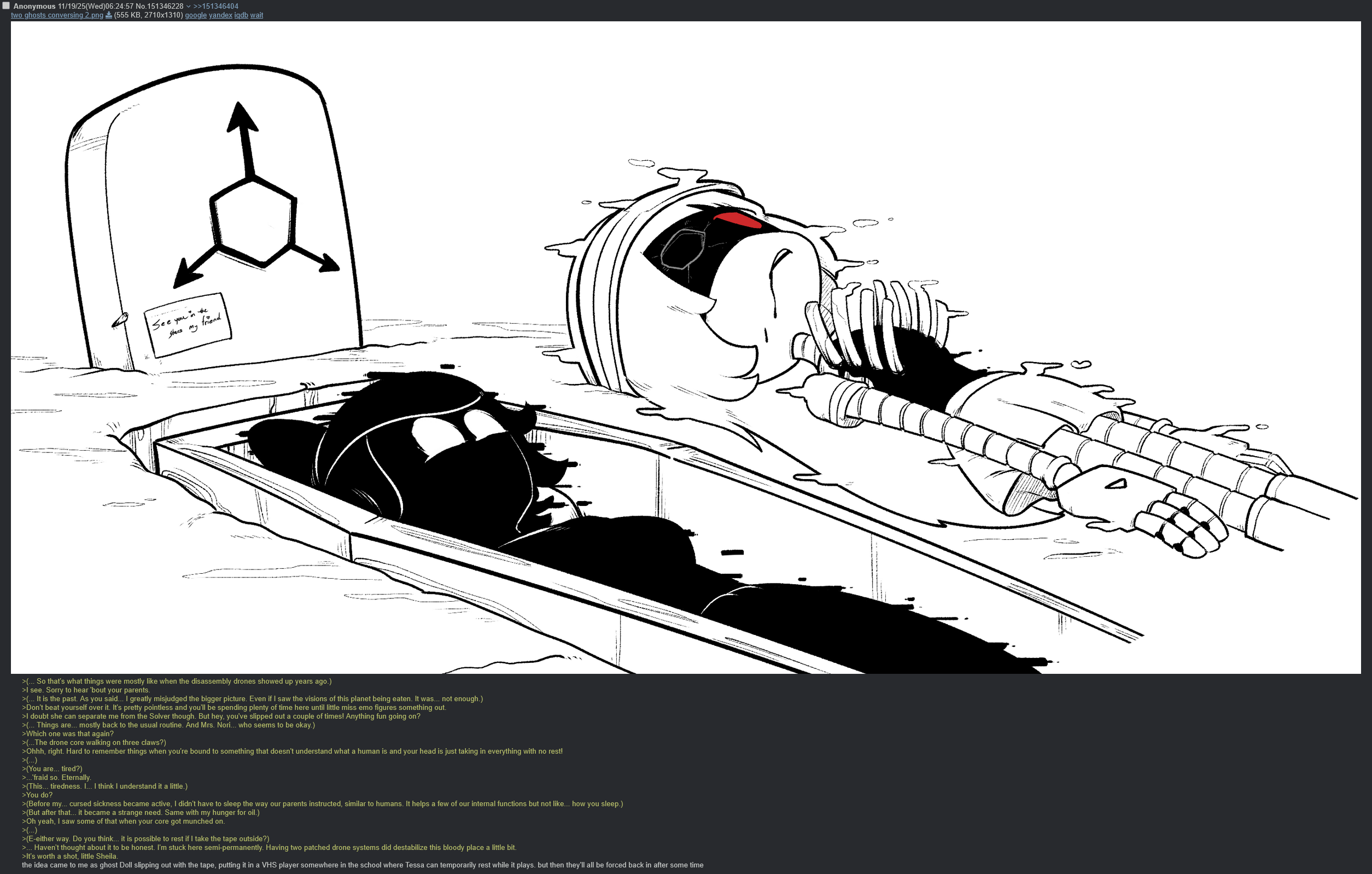 >>299709 >Be Emily good Robo Christian girl (whatever that means) >Yup, you’re a pure Robo God fearing girl >You don’t have any weird desires at all >No sir, you don’t >Alright maybe you like writing a certain kind of story a bit too much >Maybe it does make you a bit weird >But it’s nothing serious! >And you promised yourself to stop after you finished your latest one >Yes, you definitely stopped and will not start again >You’re more than ready to move on >You found yourself a friend you can spend time with instead of writing silly stories right? >Well and here things get complicated >Your friend is a fellow weirdo >You think that’s why you became friends so fast >You’ve only known her a day and you’re already having a sleepover party >Though she is a bit more weird than you >Suicidally so >You barely believe that what happened wasn’t a dream >She dragged you outside the safety of the bunker to hunt murder drones >And somehow you managed to kill one! >And then it got up! >A human brought it back to life! >You knew they were great but… >That human… >Why couldn’t it be a dude? >Why a girl? You…. >No! NO! >Emily get your head straight you need to stop thinking about this stuff >It’s late in the night, you and Uzi decided to go to sleep, you spend a lot of time pouring over... >….That book >The one Uzi stole from the human >She says it holds some occult power >Maybe >But you see something else in that tome >You see wretched inspiration in it’s illustrations >The moment you laid your eyes on it you begun copying the pictures from it >Oh how you envied the drones in them... >Uzi is already asleep, but you toss and turn unable to rest >Maybe just one more look? >A few more pages it wouldn’t hurt… >No you promised you’d stop >Your parents wouldn’t like you falling to temptation >They don’t know about your… exploits >You had to lie to them to keep yourself and Uzi out of trouble >You think this is the first time you lied to your parents >More than enough reason to do right by them and not continue writing smut >You eventually manage to fall asleep >You dream of the book >Of it’s pages >Of the illustrations on those pages >You dream of a human doing the things from those pictures to you >His hands touching your chassis >He begins to move them down and down >He reaches your service hatch >He begins to trace it with his fingers >You try to resist, but it’s no use >Your hatch pops open >He reaches inside you >You can feel him touch your… >OH SWEET MOTHER OF…. >You awake screaming >You look around you >Uzi’s room, you see her clock it’s 9 am >Uzi is still asleep, your screaming didn’t wake her >You get up and prepare to leave >You should get away from IT >Oh but it’s right here at your feet… >If you just open it and read a bit…. >No! You run out of Uzi’s room >You enter the living room >Mr Doorman is here, getting ready to leave for work “Hey there Emily you’re leaving already? Hope you two had fun” >Good morning Mister Doorman. Yes we had fun Mister Doorman. Goodbye Mister Doorman >You walk past him in a rush >Once you leave the Doorman household and enter the outposts corridors you begin to run >You run and run until you reach your home >You enter and are greeted by Mom and Dad “Emily! You’re back! How was the sleepover? You two gossiped about something juicy? Maybe you styled your hair?” >She hugs you and waits for your response >”We.. ugh… talked about common interests and read some books?” “Ohhh! You two are starting a little book club? You hear that honey? You were worried Uzi would be a bad influence!” >Dad grumbles before responding “Perhaps I misjudged the Doorman girl, she is still Khan’s daughter and he is a good man, but it’s still a good idea to be cautious” >This is the closest dad has ever come to admitting he was wrong about something >You feel something heavy settle on your core >It’s guilt for saying half-truths >Your mom lets you go and you enter your room >The door closes behind you and you take a deep breath >Alright, time to relax a bit, take your mind off things >You sit down at your desk and turn your PC on >It boots up and you open the folder called HMOFD