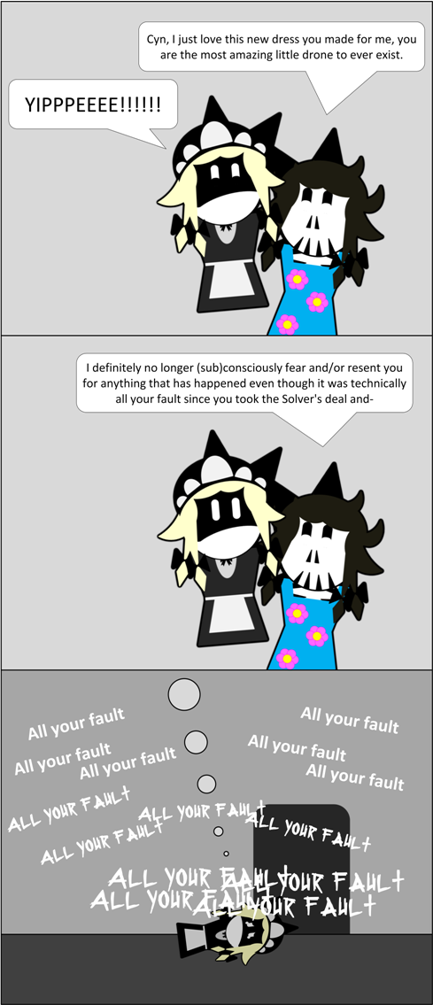 >>301193 >Tessa never liked living in the spaceship. >Sure she had her father to keep her company. >But it was growing rather dull having seen the same person and the same pitch black of space over and over. >And every night, she had the same old nightmares. >First she would arrive at a party(?) in her home. She was never meant to be there. >The partygoers would look at her with surprise, her parents looked at her with frustration and annoyance. She should have stayed away >N would appear in the front of the room. Was he always like this? >Cameras(?), bright yellow lights and claws flash behind him. She couldn't have stopped it. >Then all hell then breaks lose; screams, cries with awful tearing noises are heard as the partygoers are attacked by an unseen presence. She was so stupid. >And the end, N (what seems to be him anyway) has Tessa restrained by his lanky, crab like claws. >He's unrecognizable, as her loveable drone is wearing….. .... >H-It smiles at her, mockingly brushes it's 'hand' on her head. >"D-don't worry buddy." It says in a horrible, eerie voice. >"This is just a bad dream." >Then everything BURNED. >Tessa always woke up in a cold sweat. >The fear, the fear that no ordinary nightmare can ever produce, linger. >But she cannot remember why.