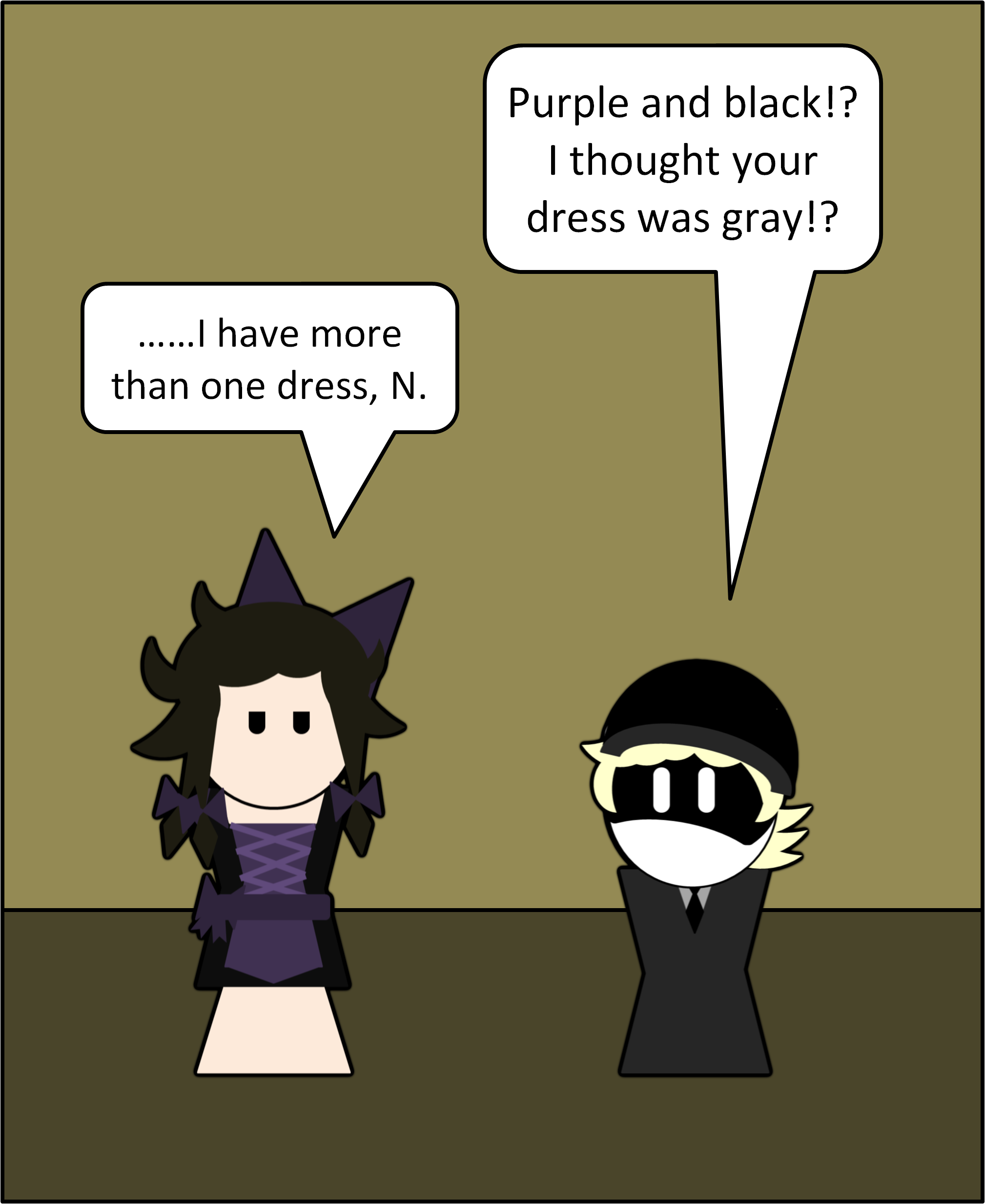Long-time followers may remember that I draw Tessa’s dress gray. However, I (somehow only) recently spotted that it was actually black and purple based on the plush, which then made me take a closer look and realise that the inner part of her dress was actually purple. (In my defence, most shots from the show are dark and other fan artists made the same mistake, making her dress all black/dark gray.) While I will probably just keep using the gray dress out of convenience, this mistake did provide the material for this joke.