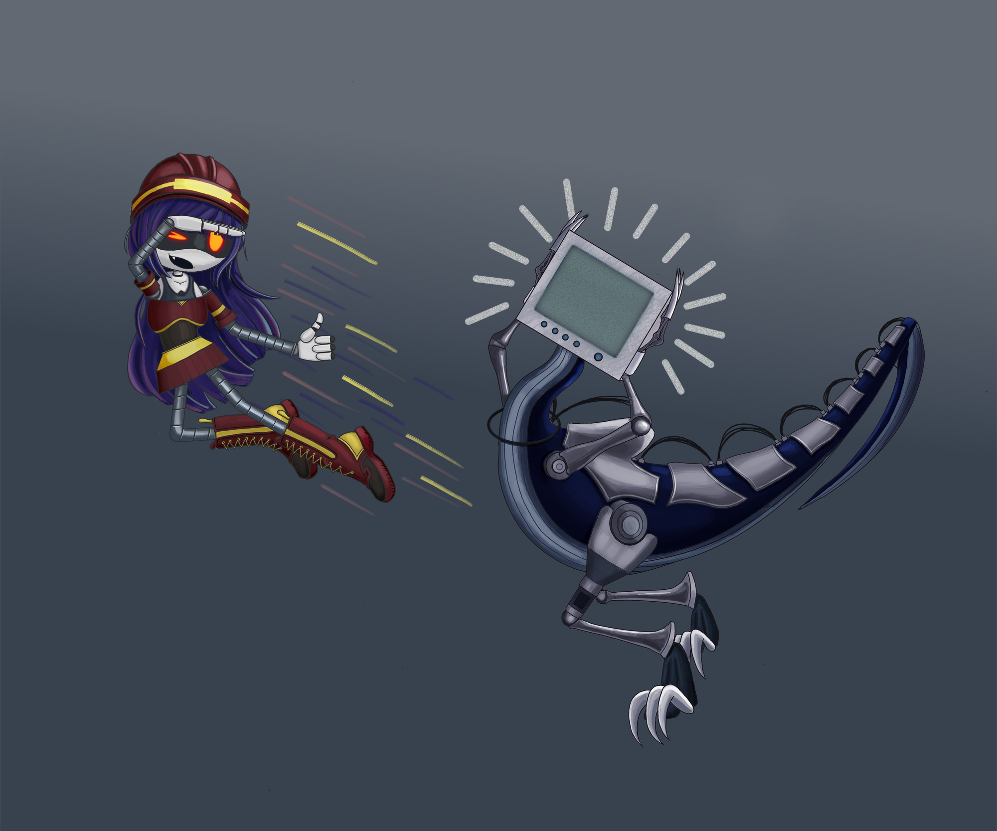 >"Well, your core's still as fine as it's ever gonna be," Alice said as she removed the diagnostic tool from Nori's battered core and concluded her checkup. Satisfied, she put Mrs. Doorman's chest display back in its slot, covering her core back up. "Um, do you want me to..." >"Just bring this thing up, I can do the rest," Nori said. Even all these years later, Nori's muffled, occasionally stuttering voice still weighed on Alice. Swallowing the lump of wish-I-could-have-done-more in her throat, Alice tilted the back of the exam table up, bringing Nori into a sitting position. After a minute of fumbling with the slider, Nori managed to zip her coat back up, before looking to her side to face Alice. A frown spread across her face as her blind eye glitched out for a second. "You know, I, uh, I'm starting to think Uzi blames you for... how I am n-now." Alice sighed. "I probably gave her a bad impre-e-ession when I got back home. I was still mad at you about..." Nori winced, her blind eye glitching out again. "Sorry about that, I know you wanted to help us." >That talk after Nori woke up from emergency repairs played out before Alice's eyes once again. The explanation of how AI cores work and what happened to Nori's, carefully, delicately bringing up there are aids available... Nori lashing out at her and accusing her of thinking she's a burden who can't take care of herself now, Nori's voice cutting in and out from the exertion her outrage was putting on her speech synthesis, the crutches being gently tossed to the ground rather than flung at the wall like Nori meant them to be, Nori leaning against the wall the whole time she was shuffling out of the room, her free hand propping her head up, her good eye almost alone on her visor and glaring at Alice like she was trying to hate her to death... "You had me scared your core was gonna give out 'fore you could get to the waitin' room," Alice muttered. Alice walked over to the sink and drummed her fingers on the counter. Robo-God, how is she going to bring this up... >"Speaking of, I'm open to whatev-ver else you could have for..." Nori trailed off as she turned on the exam table, preparing to leave soon. "Now..." Alice's entire body relaxed at the realization Nori brought up the matter for her. She opened up the tall cabinet door next to the counter. >"I don't wanna open up any old wounds here, so..." Alice reached into the back of the cabinet, and grabbed what she hoped would be less of an offense to the dignity of the better adjusted and comparatively calmer Nori in the room with her than crutches were to the emotionally raw Nori she walked into her office all those years ago. "Think you'd be up for, uh... this...?" she asked as she took the cane out. "Adjustable, ergonomic... bunch of other stuff in the brochure..." Alice brought it over to Nori. "Try, uh, gettin' off the exam table with it, see how it feels." >Once she could relax her elbows and move her wrists again, Nori took the cane by the grip. As Alice half-expected, half-hoped, once the base made contact with the pull-out step of the exam table Nori was able to get from the table to the step to the floor without much effort. Nori smiled. "Yeah, this'll do." With a small amount of effort, she looked back up to Alice. "I ta-a-ake it my insurance covers this?" >Alice grabbed a clipboard off the counter near the exam table and poured over it. "Easily." >Nori's free hand stroked the roughly chin-equivalent region of her snoot. "One last question: how much extra to put a sword in this?" >Alice wanted to cackle, but stopped herself. "You jokin', or is this one of those times where people think you're jokin' about yourself but you're actually dead serious?" >Nori cocked her head, to center her good eye more on Alice. "What do you think?" >Alice felt a phantom bead of sweat form on her forehead.