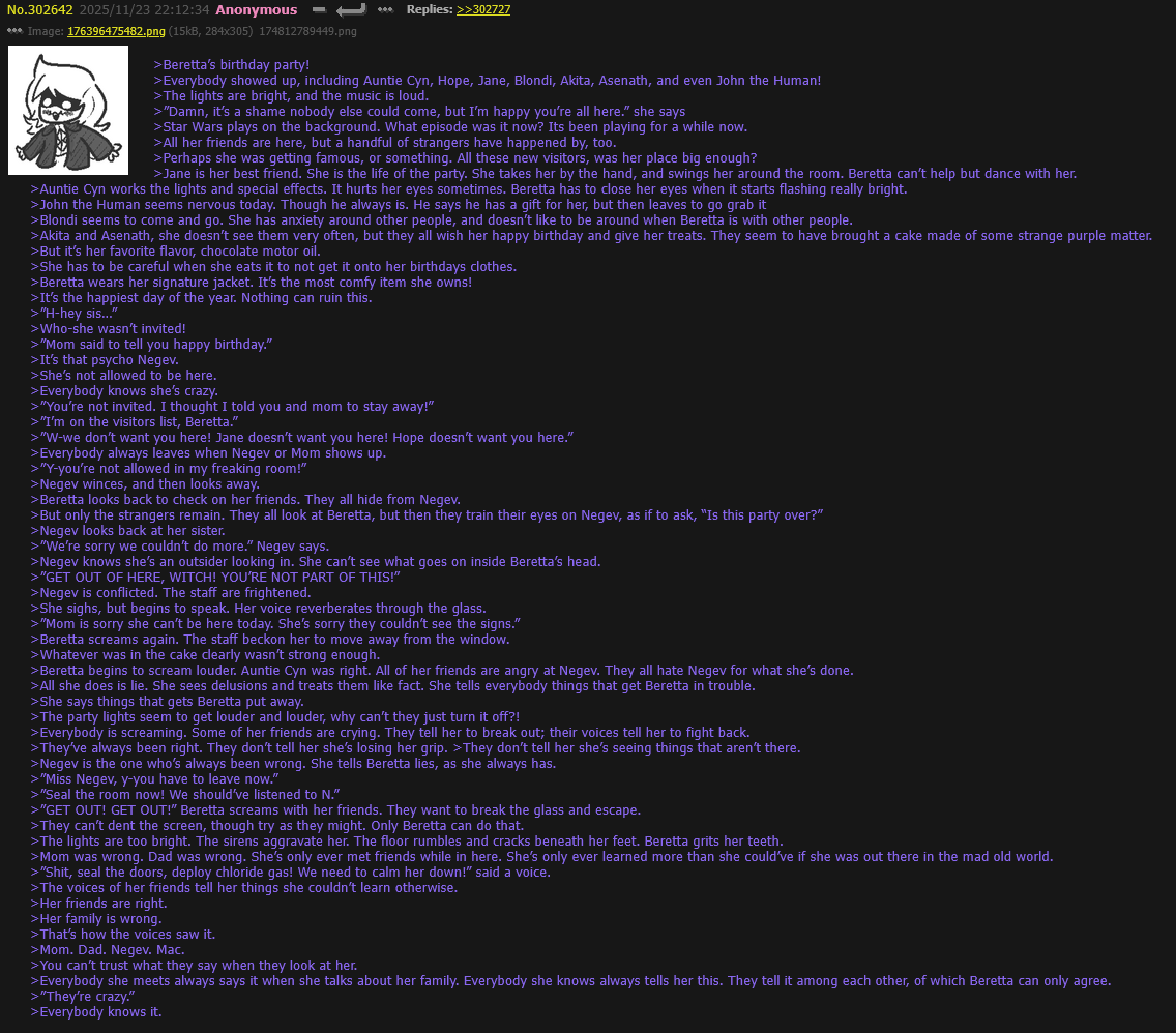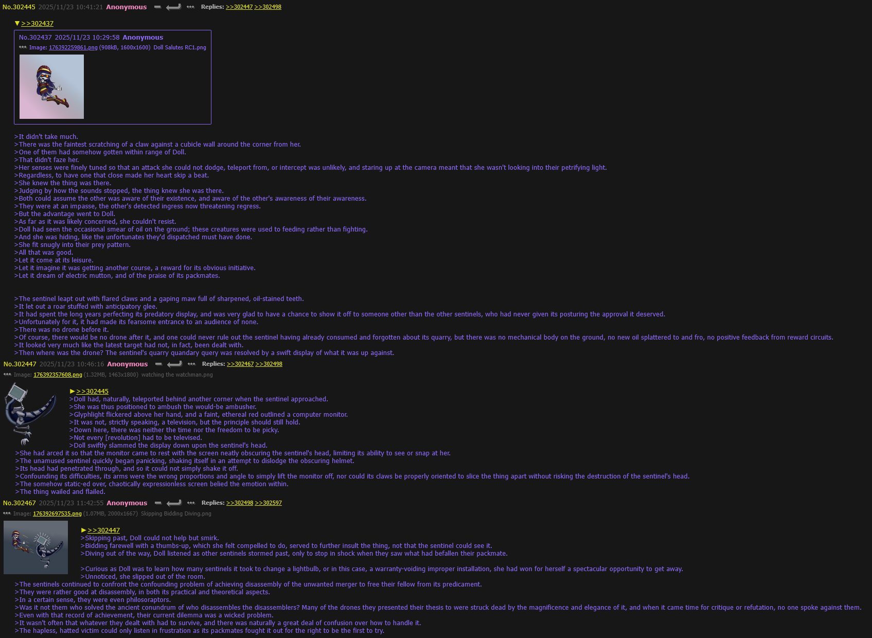 >>303646 >Some Solver war thing gets posted >Suddenly, after hours of quiet/Brief fun discussion, mass influx of posting about the same exact points every time, saying and doing the exact same things every time the same way with the same typing style >After endless debate, “posting drones” appears, followed by instantly 3 or 4 old drawings from the booth How much of these threads are even organic, I don’t know how much I can even trust canon posting. Everything feels planned and staged, just a constant barrage of shit stirring and falseflagginf over OCs. It’s too sad to consider some real people have dedicated themselves to spending all day every day to this site, waiting for something they don’t like to get posted, so they can go through their scripts