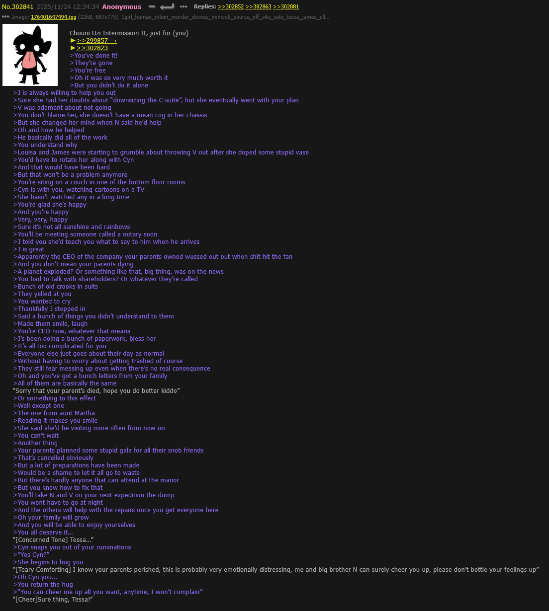 >>302841 >James & Louisa are dead as hell >Tessa became a CEO (for better or worse) >The Gala was hosted exclusively for her drones >Cyn truly is what she seemed to be Based