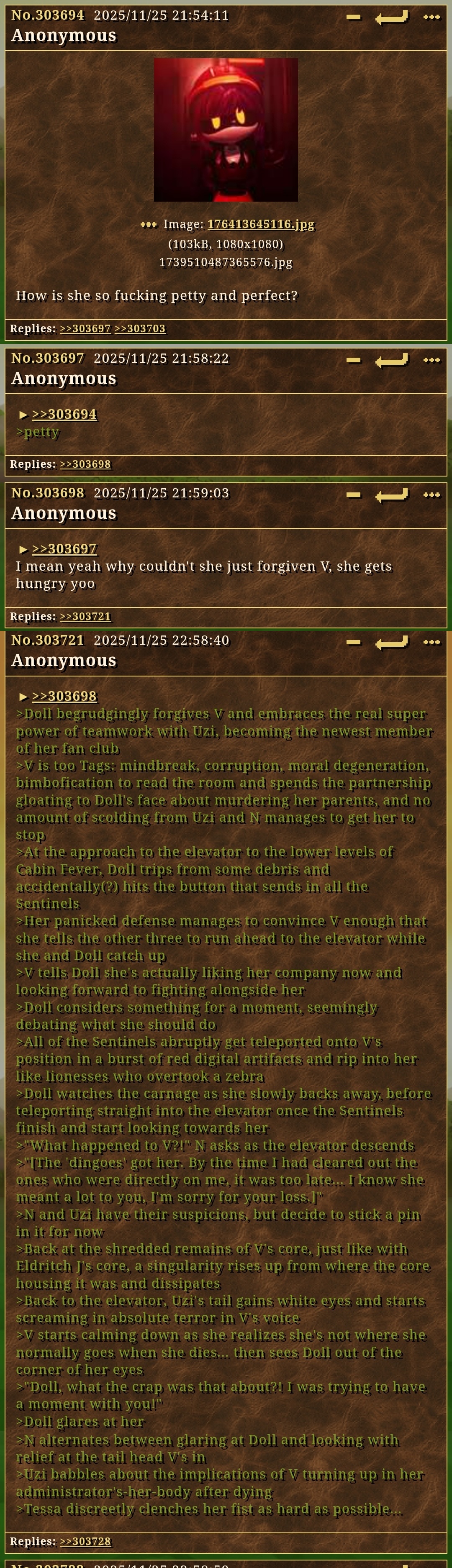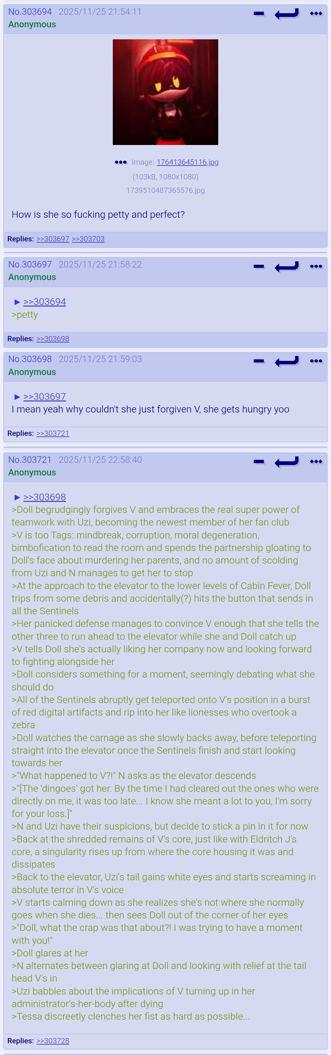 >>303698 >Doll begrudgingly forgives V and embraces the real super power of teamwork with Uzi, becoming the newest member of her fan club >V is too Tags: mindbreak, corruption, moral degeneration, bimbofication to read the room and spends the partnership gloating to Doll's face about murdering her parents, and no amount of scolding from Uzi and N manages to get her to stop >At the approach to the elevator to the lower levels of Cabin Fever, Doll trips from some debris and accidentally(?) hits the button that sends in all the Sentinels >Her panicked defense manages to convince V enough that she tells the other three to run ahead to the elevator while she and Doll catch up >V tells Doll she's actually liking her company now and looking forward to fighting alongside her >Doll considers something for a moment, seemingly debating what she should do >All of the Sentinels abruptly get teleported onto V's position in a burst of red digital artifacts and rip into her like lionesses who overtook a zebra >Doll watches the carnage as she slowly backs away, before teleporting straight into the elevator once the Sentinels finish and start looking towards her >"What happened to V?!" N asks as the elevator descends >"[The 'dingoes' got her. By the time I had cleared out the ones who were directly on me, it was too late... I know she meant a lot to you, I'm sorry for your loss.]" >N and Uzi have their suspicions, but decide to stick a pin in it for now >Back at the shredded remains of V's core, just like with Eldritch J's core, a singularity rises up from where the core housing it was and dissipates >Back to the elevator, Uzi's tail gains white eyes and starts screaming in absolute terror in V's voice >V starts calming down as she realizes she's not where she normally goes when she dies... then sees Doll out of the corner of her eyes >"Doll, what the crap was that about?! I was trying to have a moment with you!" >Doll glares at her >N alternates between glaring at Doll and looking with relief at the tail head V's in >Uzi babbles about the implications of V turning up in her administrator's-her-body after dying >Tessa discreetly clenches her fist as hard as possible...