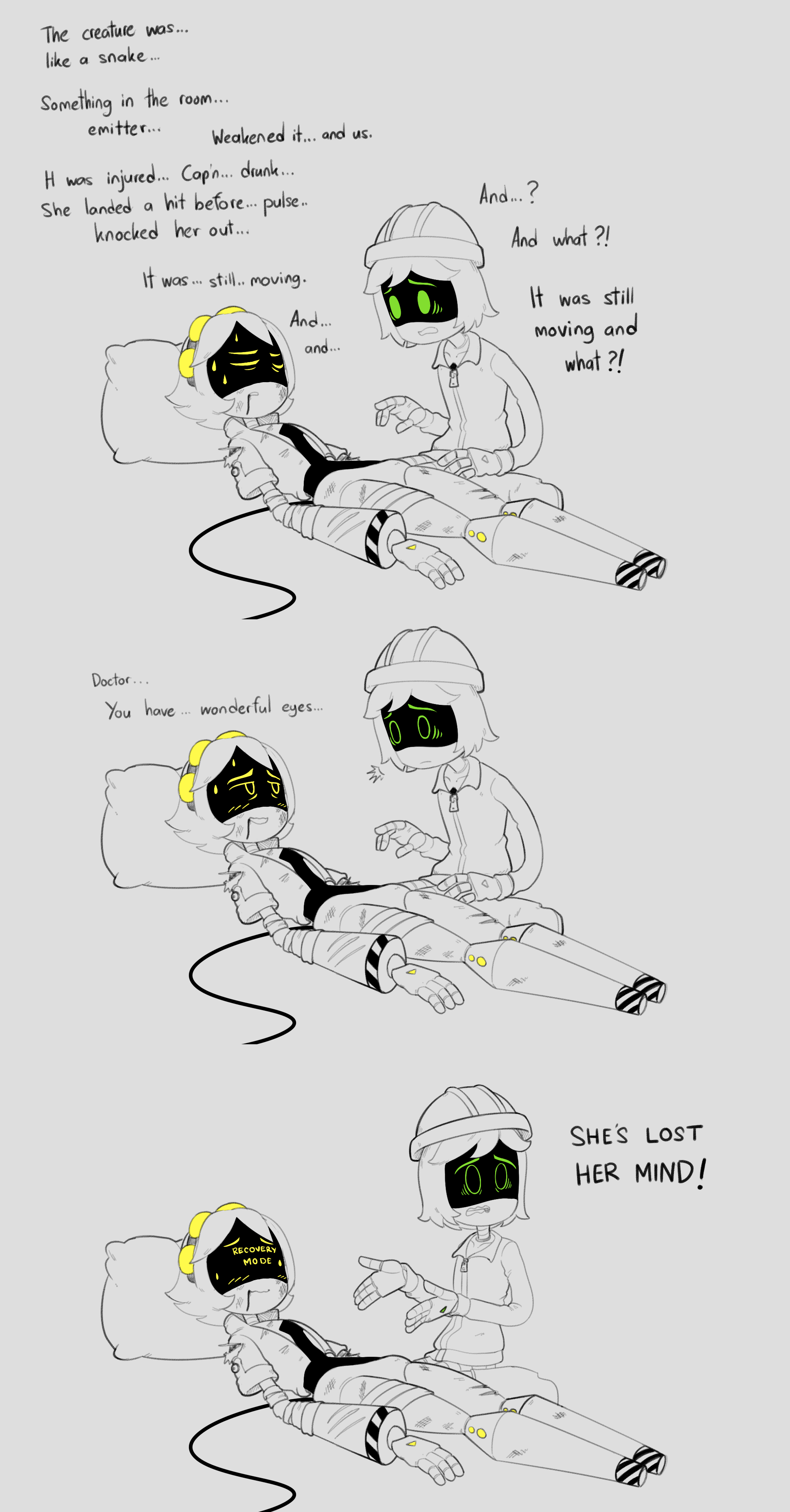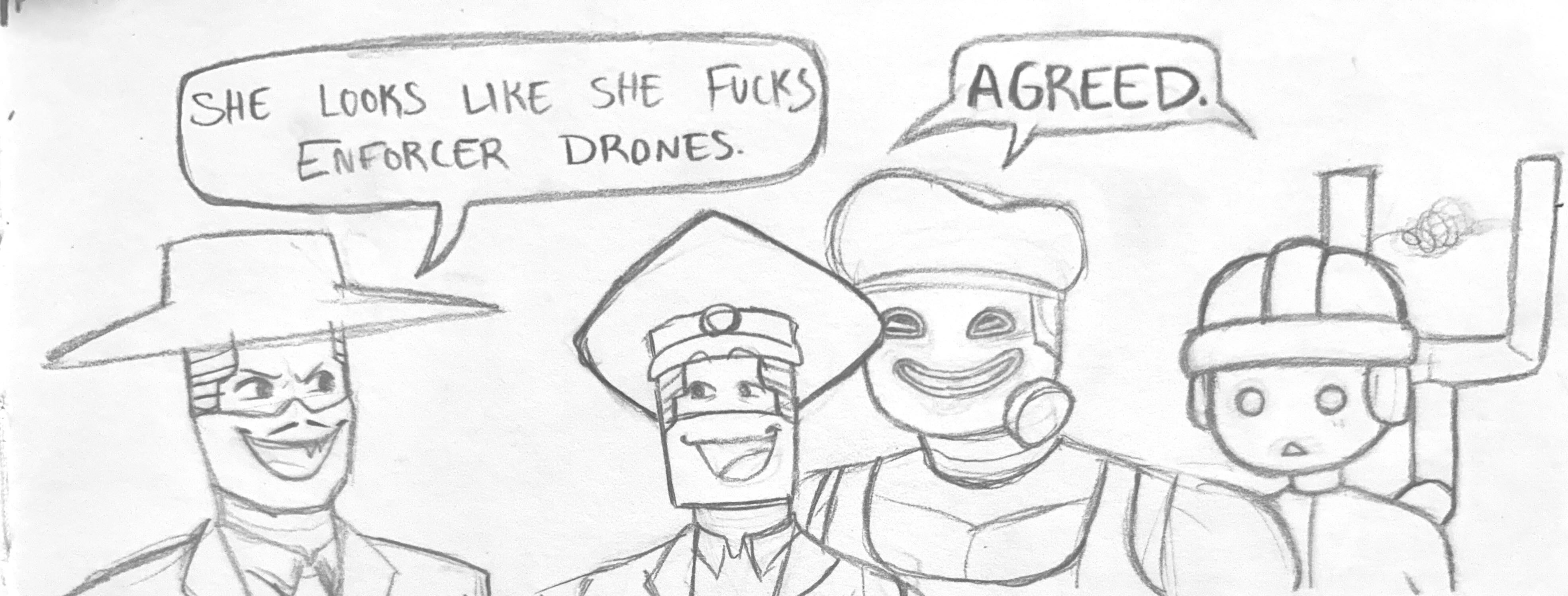 forced myself to rewrite this on my pc >molli sits at her booth, fake smile plastered on her face >her producers forced her to go to DroneCon and do a meet and greet >molli internals growlers at the degenerates she has to call fans >she turns her attention to the male disassembly drone guard, who rather than doing his job and standing by the booth is about twenty feet away hitting on a worker drone cosplayer >molli lets out a frustrated sigh and fakes a smile once again >her attention now back on the line she notices that a male sentinel drone of all things is standing in front of her >molli cranes her neck up to look him in the eye, her fake smile faltering "Hi there! D-do you want an autograph from everyone's best friend?" >the sentinel drone takes a knee to get down on eye level with her >there's a commotion somewhere else in the convention and all of the attention on her booth is taken away >the sentinel drone reaches over and grabs molli by her jaw, his hand covering her mouth >molli starts pressing her emergency silent alarm button ti get her guards attention >he takes one look at the situation and looks away, fear on his face as he sees the sentinel drone >her fear turns to terror as the larger drone stands to his full height and pulls her in close >so close that she can see her own reflection in his visor >"I could break you you know." He whispers with a dispassionate tone >the frantic animal fear molli felt turns to a deep freezing cold terror >"I could break you and nothing would happen to me. Hell I could probably take you here and now and my bosses would slap me on the wrist and your boss would just replace you." >he brings his other hand up to caress her hair >"I could go on a little monologue about how lonely I am, about how other drones are scared of me and think that I'm unstable. But what would be the point of it?" >molli shutters as he leans in and gives her cheek a long drag of his tongue >"Tell anyone about this and I'll know." >molli lets out a small squeak as she's unceremoniously dropped on the the floor >she stares at the sentinel drone as he walks off like nothing happened >her guard makes his way over to her >he holds out a hand for her >"Hey I um... saw what happened..." >molli stares at him >she slaps his hand away and sits back in her chair and hisses out at him "Leave me alone, don't act like you really care." >molli takes a deep breath to steady her nerves and puts on her fake smile again >she pretends that she's not scared as the convention starts to return to normal >she pretends to not cry on the inside