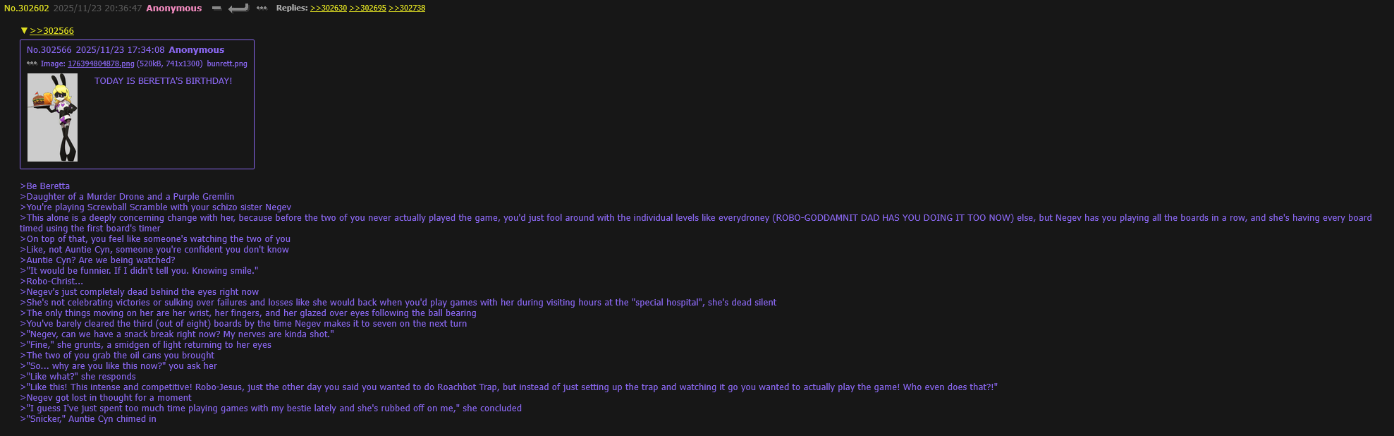 >Be Beretta >Daughter of a Murder Drone and a Purple Gremlin >You and your boyfriend P are chatting with Jane's parents >For a split second you wonder if that scene 'feels right' >Robo-God, this is like when Negev confessed to you and Mac that she feels like one day the snow outside was just snow and the next day the snow outside had always been a mix of snow and volcanic ash >Are you going crazy too? >You're dating one of your dad's friends from back when he was a worker drone, so there's probably some bad wiring somewhere... >You're broken out of your questioning your mental health when P starts telling Mr. and Mrs. Bowman about some of the goofy shit he saw N do when the two of them were butlers >You start dying of secondhand cringе >Jane makes this face