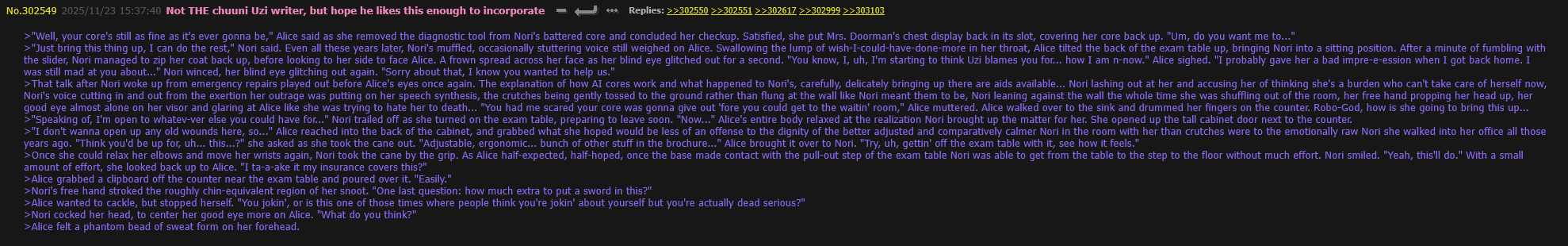 >>303212 Funne. Nice to see your work as always In the Chuuni Uzi verse this issue doesn't accur, not only becasue Tessa was able to replace N's CPU but because she also got all of her drone children new clothes