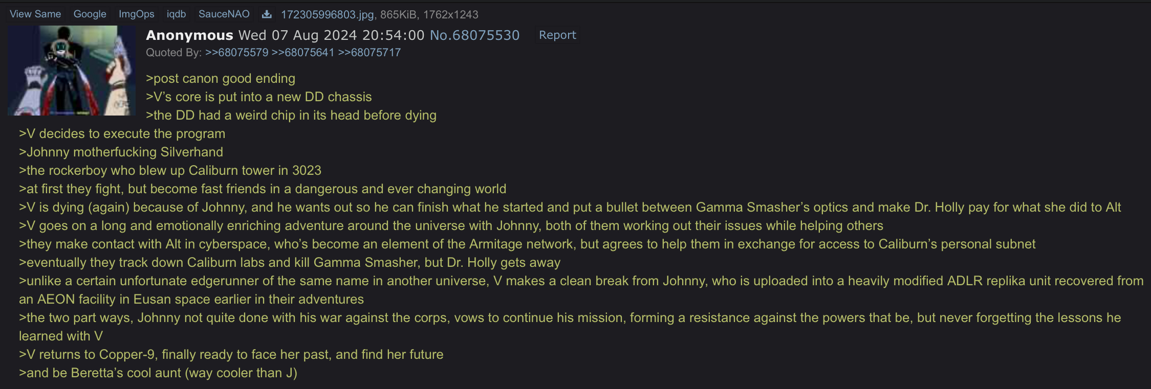 >>30898 I like to think the first J we saw genuinely thought she was corpo due to Solver messing with her memories solely for the bit and the funny (“having only V remain with some memories sounds pretty funny lol”). Somebody who knows and has accepted that death isn’t an escape wouldn’t be scared of a railgun to the face, after all. Then she brings in a full-memory J later, and probably lol’d at her in the pod before touchdown.