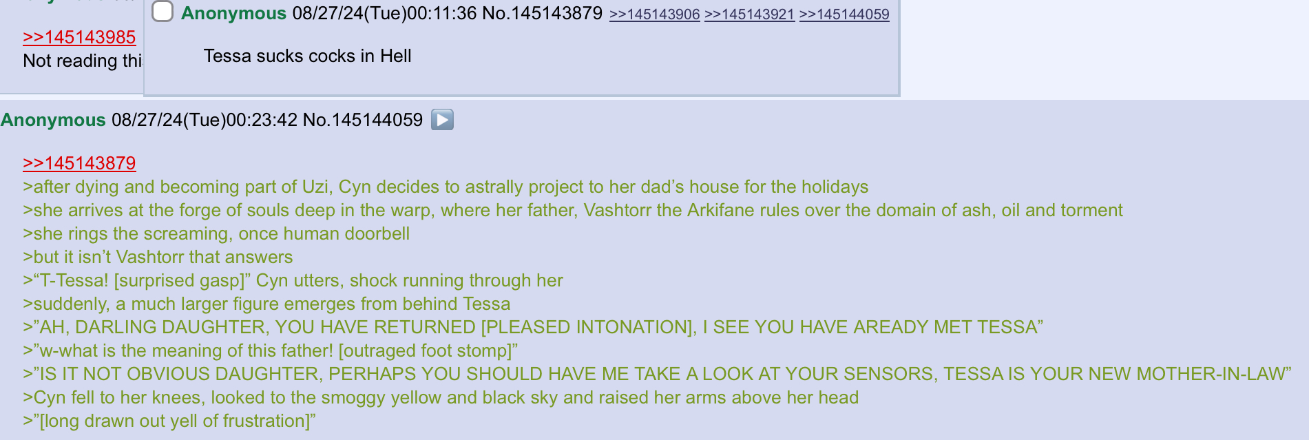 >You are chilling at home when Ghost Tessa jolts up >"What is it, Tessa?" you ask >"I feel a disturbance in the force" she replies with a cheeky facial expression >She flies out through your floor, leaving some tessaplasm behind >The ghost girl travels to the depths of the Outpost where the popular girls are using an ouija board >"Spiiriiit...spiiiirit, are you here? Answer us, spirit." >Ghost Tessa uses her poldergeist powers to more the cursor >Y-e-s >Followed by >S-u-p-c-u-n-t-s >The girls are excited but also confused >Popular Girl A asks the board if her bf is cheating on her >Y-e-s >She becomes agitated and the others try to calm her down >She angrily asks whom he is cheating on her with >W-i-l-b-u-r-t-h-e-n-e-r-d-f-r-o-m-s-c-i-e-n-c-e-c-l-a-s-s >This isn't even true. Tessa is just taking the piss out of the drones