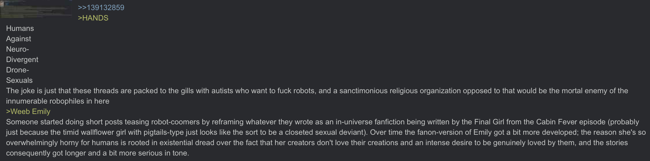 >>30943 Ah, I see. Hopefully that moderator can find something better in their life to focus all that energy towards instead of trying to crusade against Murder Drones.