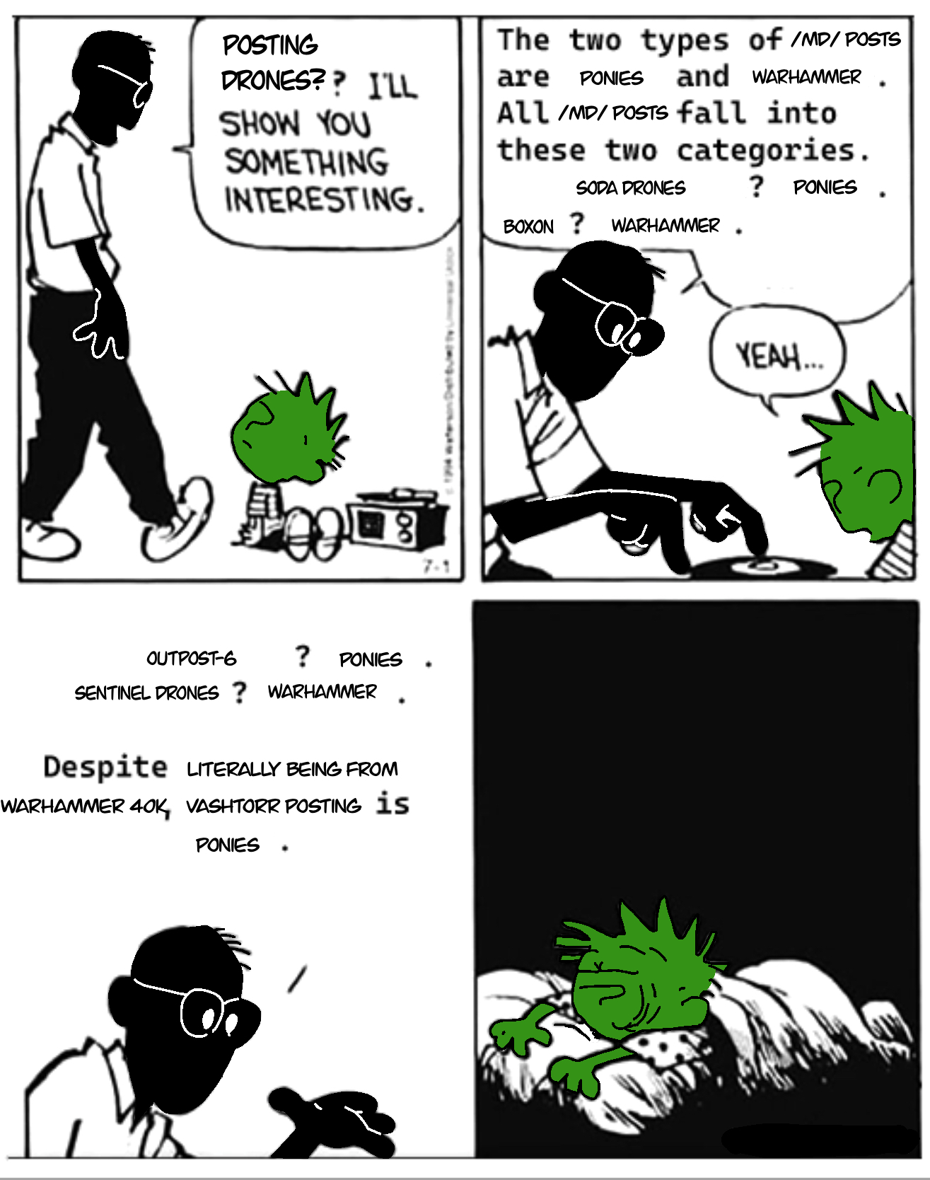 >>31302 No the basic thesis is that dronefags discuss drones in an almost identical way to how ponyfags talk about ponies (uppies, petting, human love, designing hundreds of OCs based on variations of a template) but we also autistic worldbuild and try to compare and incorporate elements from other scifi properties to create a massive free flowing toy box of ideas like warhammerfags do Thus, it’s all ponies & warhammer