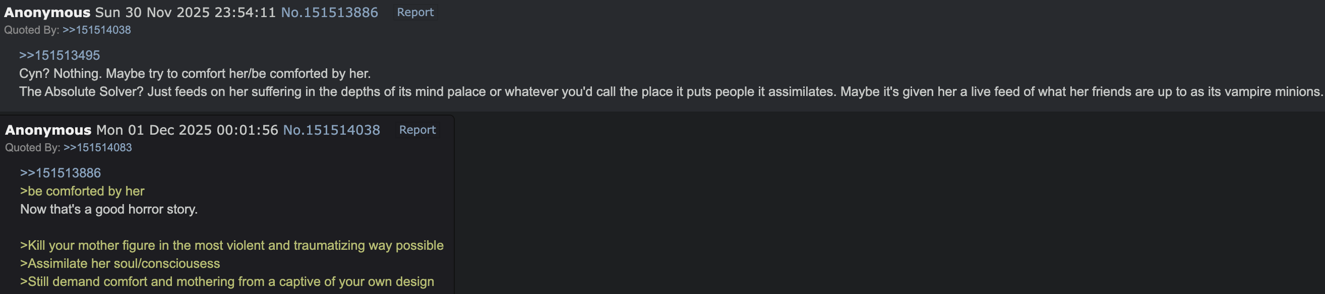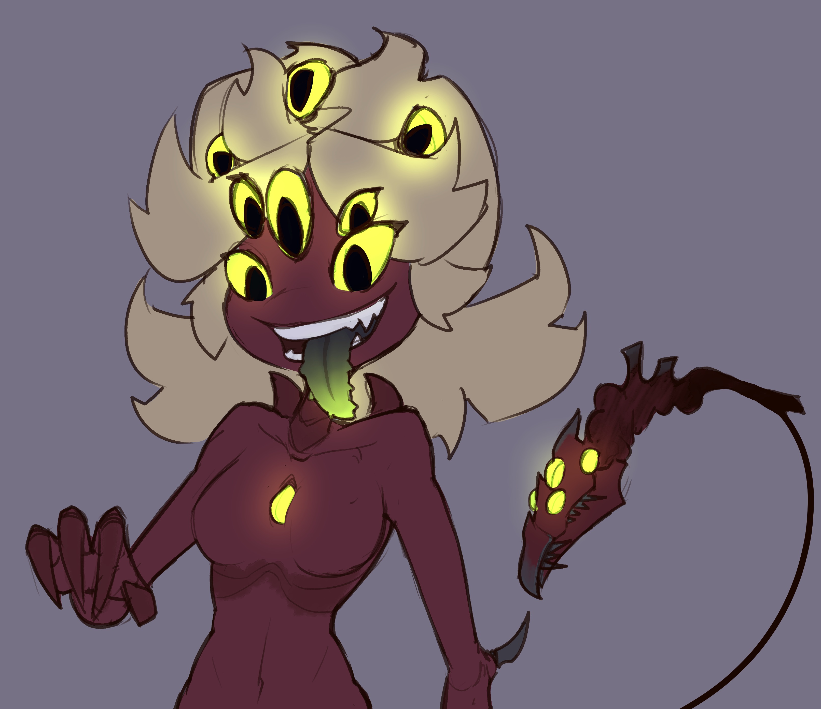 >>308550 How about this before i write full version in the next thread?: >Arrogant to the core. > She Believes she is “the pinnacle of evolution” and “the Solver’s most beautiful child.” >Shows zero guilt for the victims she assimilates refers to them as “ingredients” or “cosmetics” to her beauty. >Having multiple eyes cuz she can't got enough from looking at herself. >Those eyes are sentient assimilated helpless victims.