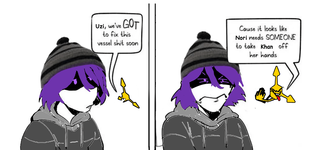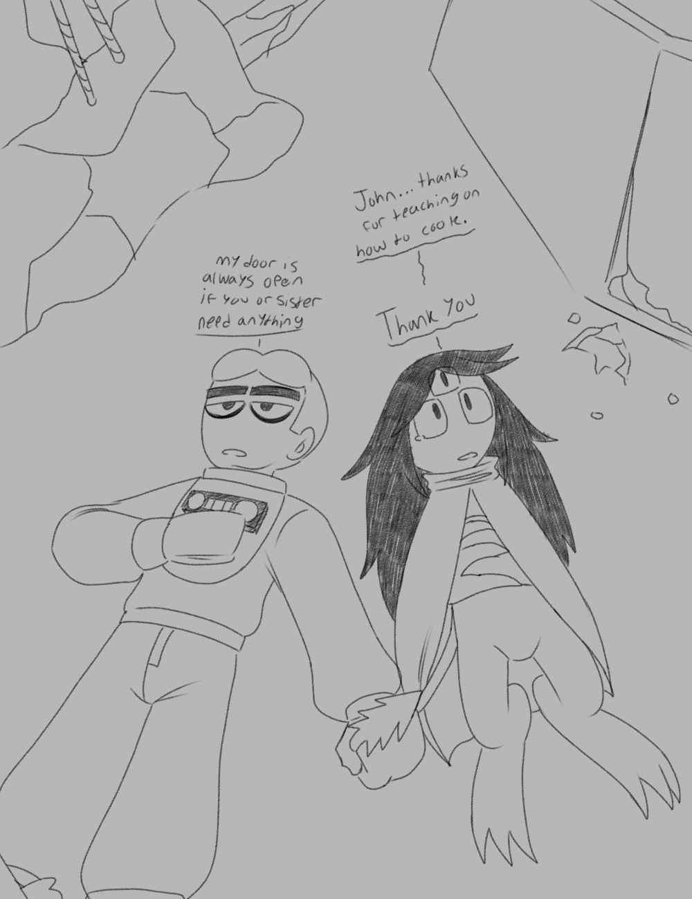 A short John and Arrow green >It was a normal calm night on Copper 9 >As Arrow lay down next to John looking up towards the night sky >For these past few weeks Arrow have developed mix feelings towards John >More promptly the way how he treats her and her sister Akita or even that one being that calls himself "God" >He doesn't give them any malice,fear, disgust or any negative emotions but instead with patience >And this did nothing throw her into a loop on "why?" >"Why? Be more patience with us? What is the end goal here? What does he want from us?" Boggles over and over >Till on this very day she ask him >Arrow:"Hey John...and I ask you something?" >John:"What is it kid, what's you got on your mind" >Arrow:"Why do you treat us differently from the drones? We were once like them...well at least me and Akita not sure on the "God" fellow...but still why? And also why do you still call me a kid?" >John pause for a moment before taking a deep sigh >John:"That's because you and your sister are still learning about life. Learning to be comfortable not only with yourselves but also how to go about life." >John:"In other words your just the new normal that comes with time. And with this new normal will come with their mistakes, like any other normal that came before" >John:"Only difference is to be more acceptable of those mistakes. For every bruise,cut, burn or whatever mistake you make: accept it. Do not deny it but instead improve upon it. And if it fails at least you know you did your best and saw it through to the very end." >John:"That's why I'm patience with you,akita and of course them as well. Your still growing, still learning. And I'm not happy that you guys make mistakes but learned from it and improve upon it...even when it doesn't succeed" >John:"At least you're doing better than us...those who aren't willing to accept those failures or didn't see it through all the way. Making sure you don't repeat the same mistakes like us" >John:"My last advice for you is that when life give you a moment of "nostalgia"...make sure it doesn't be filled with pain like mines...make sure its filled with bittersweetness...at least those moments you have with them will all the better" >During John's talk Arrow slowly crept her tail around John hand making sure he doesn't notice >For his words brought a strange sort of comfort towards her >Arrow:"Hey John....Thanks for teaching me how to cook..." >John:"...My door is always open if you or your sister need anything" >Arrow:"Thank you..." >And after she said that line it almost as if John gently grasp her tail a little bit tighter >Perhaps its was his weird way to express a hug The end