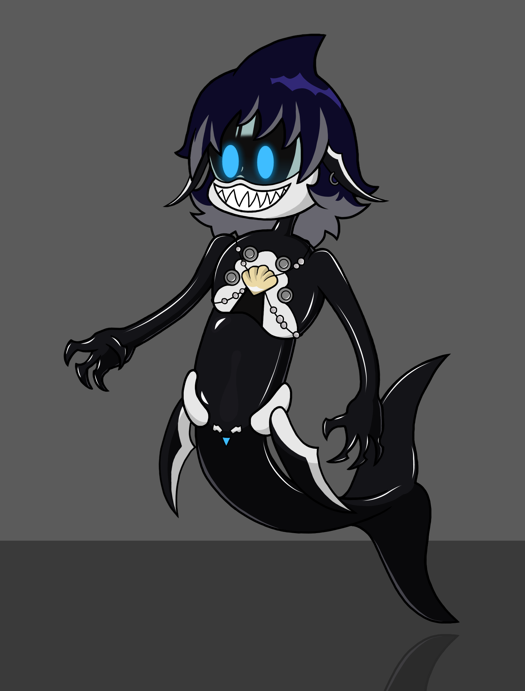 >one of many new races of Drones from this future, being specialized for aquatic environments and completely abandoning dry land >they're unique among most races thanks to the fact that their origin is mostly a mystery; most new races have emerged from a need of customization which in time evolved into permanent traits that have separated the base model Worker Drone into several distinct races, yet no one knows what pushed the formation of the Riptide >this extends to the shark Drones themselves, as their true origin has been lost, with most only recounting their “birthplace” being from deep underwater, more specifically an “ocean in an eternal night” >some have taken this saying to inditate the abyss being their origin, while the more superstitions folk believe them to come from Cocytus, the mythical underground ocean said to reside under Makai, the lowest layer of “hell”, which has unfortunately caused them to be seen as demons >regardless, the Riptides don't take this beliefs to heart, which is why they still maintain friendly relationships with land Drones, at least the populations that live in the Closed Sea thanks to their generation spanning alliance with the Liberians (sea fairing folk, not exactly pirates, but they do burrow the esthetic) >as mentioned before, Riptide Drones have all but abandoned life on land, trading their legs for fins and a tail, with their overall look being heavily reminiscent of sharks >the rubbery polymer that usually covers the lower abdomen of a regular Drone has been extended to a much bigger degree, now covering the entirety of their tail and their arms, providing insulation from salt water corrosion >their fingers now end in sharp claws while curiously lacking webbing between them >their teeth are far sharper that a regular Drone's, which they need to be in order to fulfill their main purpose of biting and slicing through metal >Riptide Drones primarily feed on metal, which is fairly abundant in C-9's oceans due to aquatic class Sentinels along with old ships from the era of man that have long since sank; they don't care how rusty the metal is, as long as they can shove it down their gullet >their feeding method is the standard chewing rather than swallowing big pieces, however it's the method they use to “bite” chunks of metal off large structures that tend to make them incredibly famous and somewhat feared >Riptides can open their mouths almost 150°, however once they sink their teeth in something, they don't bite a chunk out immediately, instead their jaws start to rotate in a semi circular motion, with the upper and lower jaws always going opposite direction; the process is lightning fast, their teeth springing to life and sawing off a chunk of metal which they then proceed to bite normally out of it; >this freaky attribute of theirs allows them to bite through virtually anything, being able to use even one of their jaws as an improvised buzzsaw, slicing through even the toughest of cables or doors; >another curious trait that Riptides possess that has made them looked at with suspicious eyes by so many is their ability to give “birth” >essentially, all female Riptides are born with a small Pillbaby already inside them and when the time comes for the new set of parents to harbor an offspring, the mother with take all the data shared by the father, which combined with hers which will then be transferred in the Pillbaby inside her; after approximately two months, the mother's abdomen will actually split open, although at a special spot that will immediately reseal itself >what comes out of the Mother Riptide isn't a normal Pillbaby, however, but instead a special sack that contains the baby known as a “Mermaid Purse”, which is a bizarre type of plant many have compared to a Sapling, its usually soft body now a hard shell meant to protect the infant inside >after three months (the full process will be explained in its own entry), the juvenile Riptide will emerge out of the Mermaid Purse, fully functional >this strange birth process has proven to be an incredibly massive advantage to the Riptides, essentially removing the need for any Nursery Factories, allowing them to be one of the only truly self sustaining Drone races, however the Mermaid Purse potentially being a Sapling has made many a lot more curious about the origin of these shark Drones, proving that they may indeed originate from the Heavenly Lands, yet the original location or motive behind their creation still remains unsolved >while the populations of Riptides that inhabit the Closed Sea are quite friendly towards land Drones, that's not always the case with Riptides that can be found across all of Copper-9, with some being actively antagonistic towards “two legs”, while others may have gone their entire lives never even seeing a land Drone