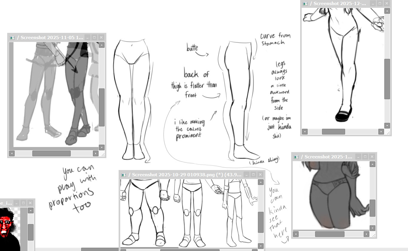 >>308865 I'm not really good at explaining but I hope this helps at least a little. I use references a lot too so if you want what I go for in specific, you can reference the same thing I do; I usually ref anime-manga art from the years between 2007-2011 on sites like gelbooru, and I also reference art by adam warren a lot (author of the comic "empowered" and artist of the sexually ambiguous raiden pic that most people would recognize him for) ₍₍⚞(˶˃ ᵕ ˂˶)⚟⁾⁾ I can also make a little leg drawing collage if that helps