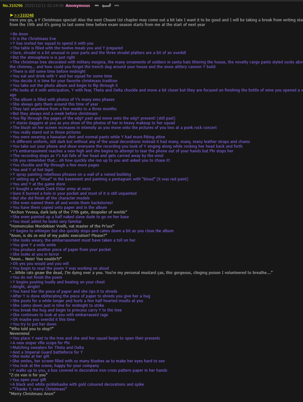 >>310248 Here you go, a Y Christmass special! Also the next Chuuni Uzi chapter may come out a bit late I want it to be good and I will be taking a break from writing starting from the 19th and it's going to last some time before exam season starts from me at the start of next year