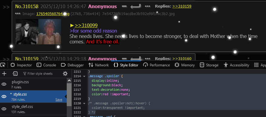 >>310176 For a quicky and dirty method you'd have to do this manually on each page reload but you can modify the stylesheet to comment out spoilers being hidden when not hovering over them, and that automatically shows them. You can also change text to red or whatever color you want directly above the code block. On Firefox you can just do it with F12->Style editor->Select style.ss->Ctrl+F->Type in .message .spoiler:not(:hover). Think on Chrome you have to go to Sources after pressing F12 and find the stylesheet yourself.