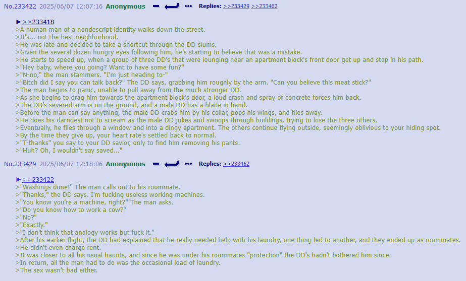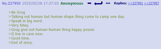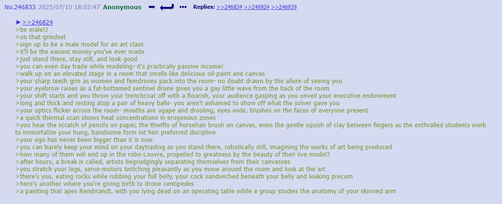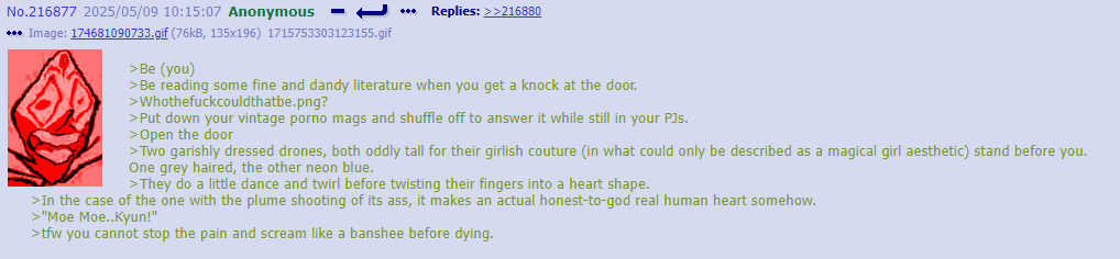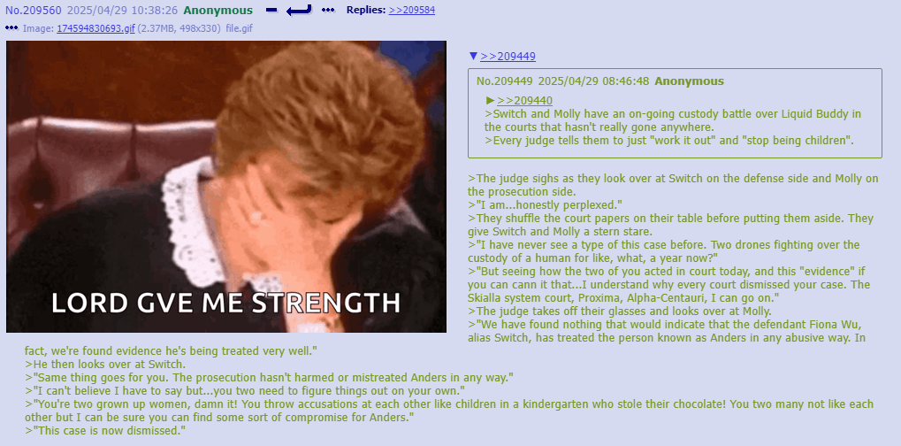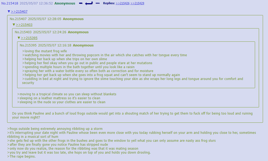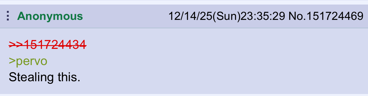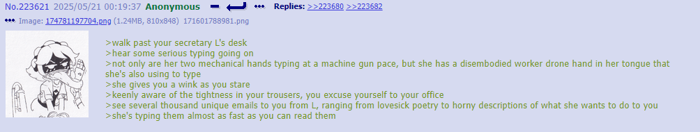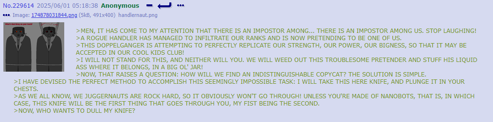 >>312637 uhhh… uhhhhhh… >Anon proceeded to become unnervingly lost in thought for 7-and-a-half hours before speaking again. “About yay big.” >He refused to elaborate on this statement.