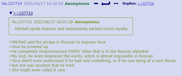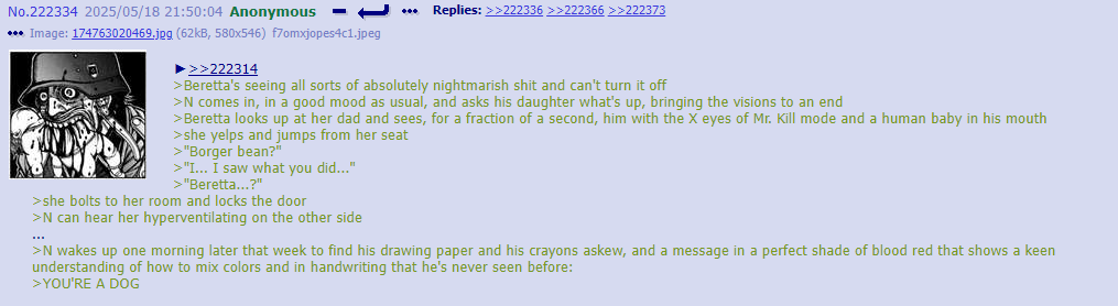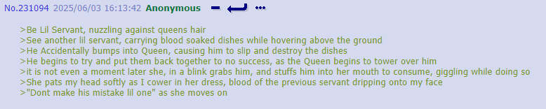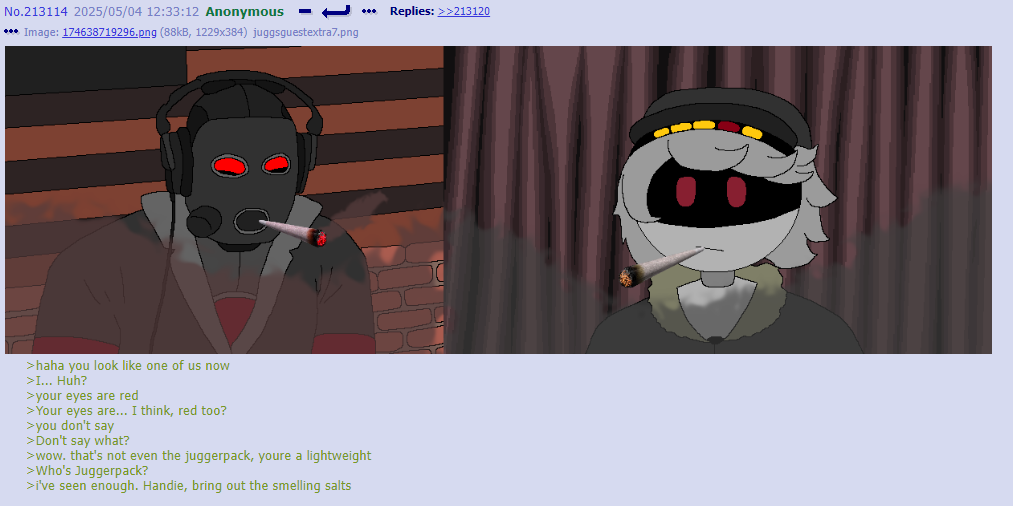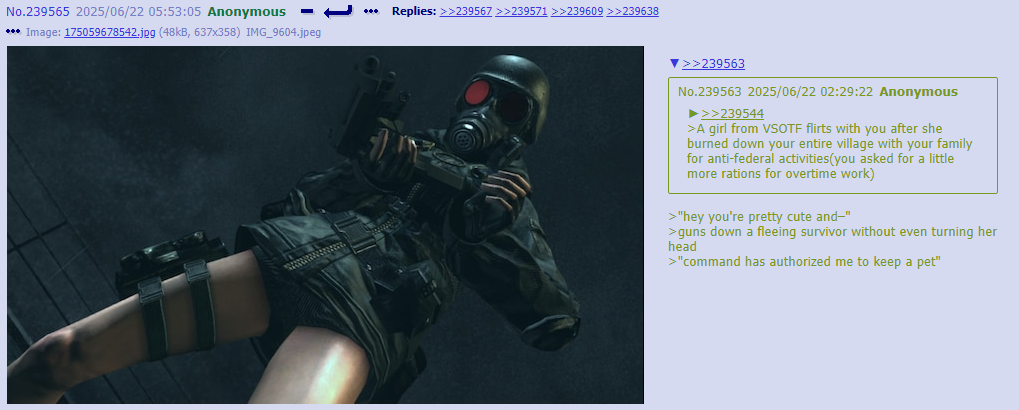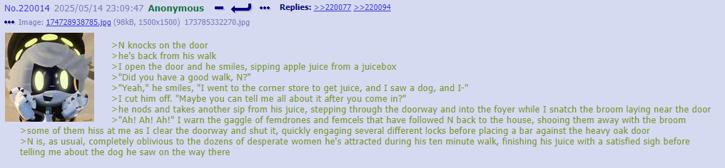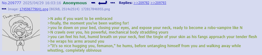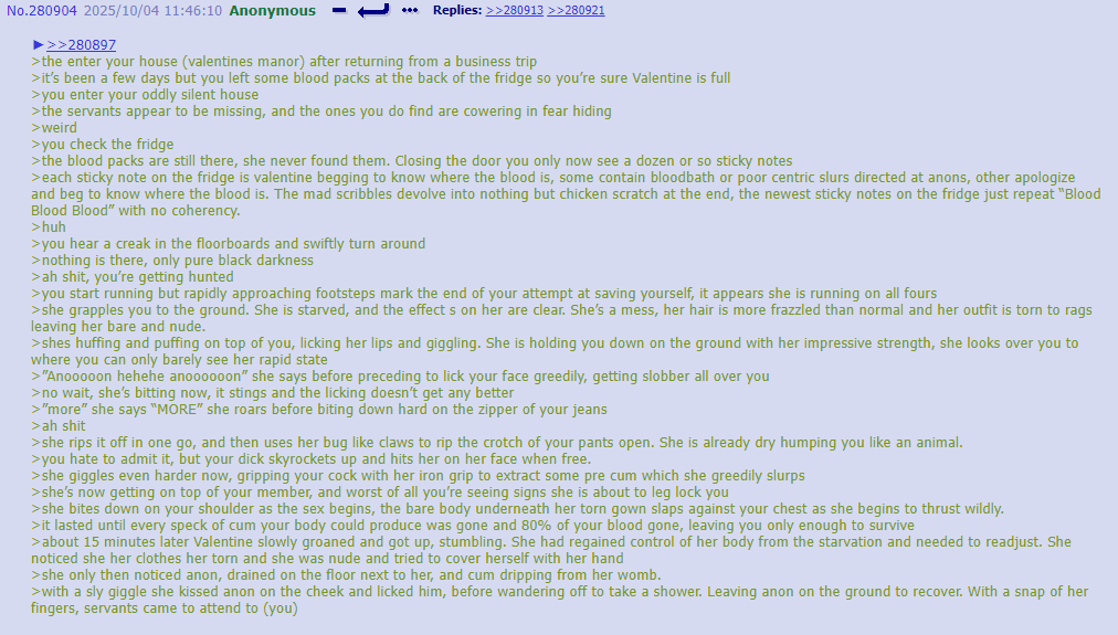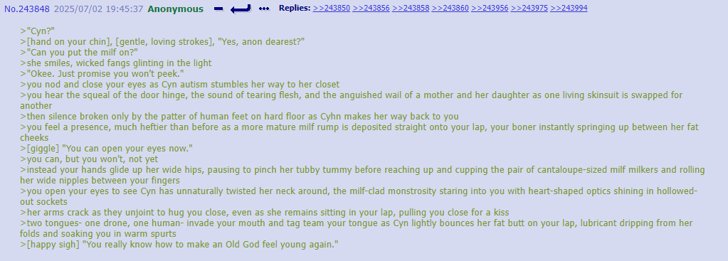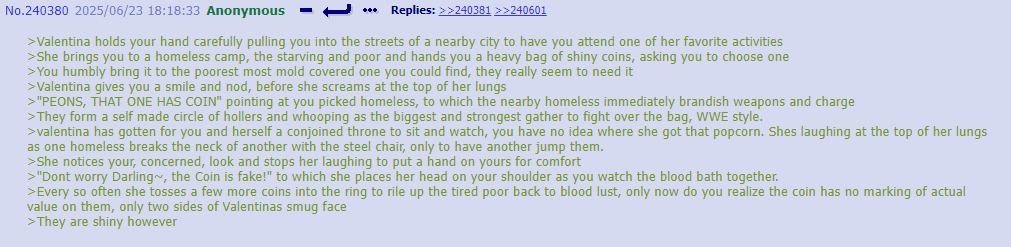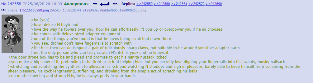I think you guys are putting more thought into thread lore then any original writefag ever did. Cyn manipulates people in greens because it’s funny and she’s cruel