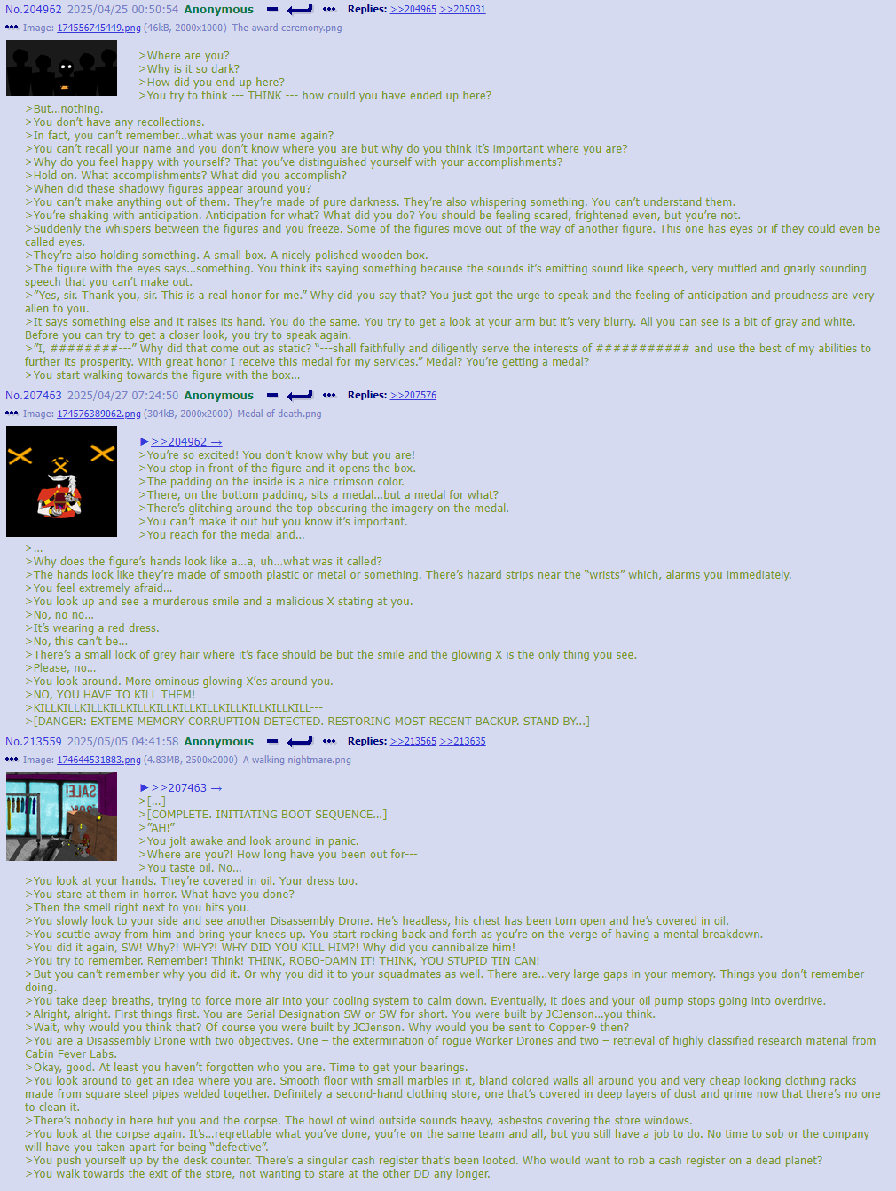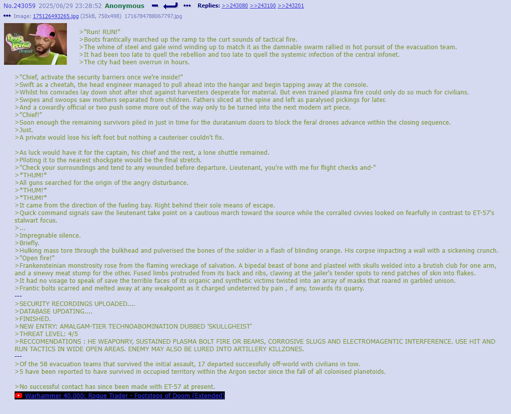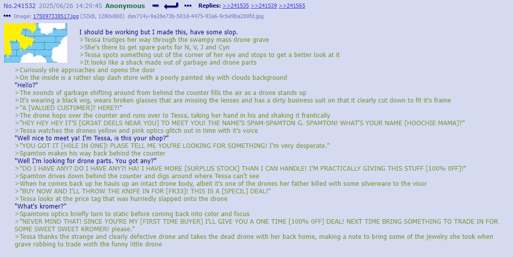 >>312439 >Inside a shattered control room, Serial Designation C# hunched over a scavenged desk, his alloy claws clutching a crumpled sheet of paper etched with jagged musical notes. He tore the paper in half, letting the pieces drift to the oil-stained floor.