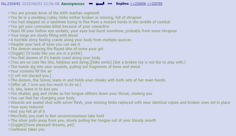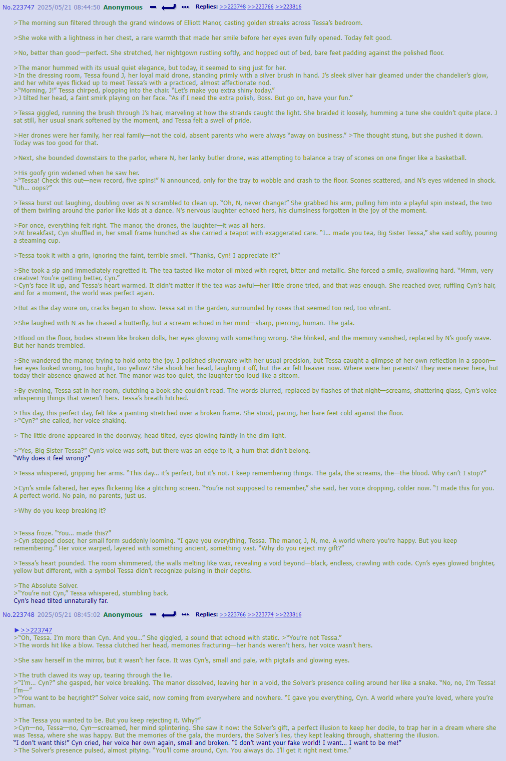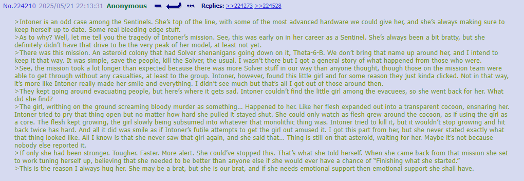 >Before she could ask, before the students could attack, he began to hum. The melody was soft at first, deceptively gentle, like the notes he once played on the manor’s piano. >Then it warped with strange frequencies folding in on themselves, too high and too low at once, a sound that clawed at the edges of Fb’s processors. >"What are you..." >After the humming stopped the children froze. >Their weapons clattered to the floor, they were swallowed by the eldritch hum.