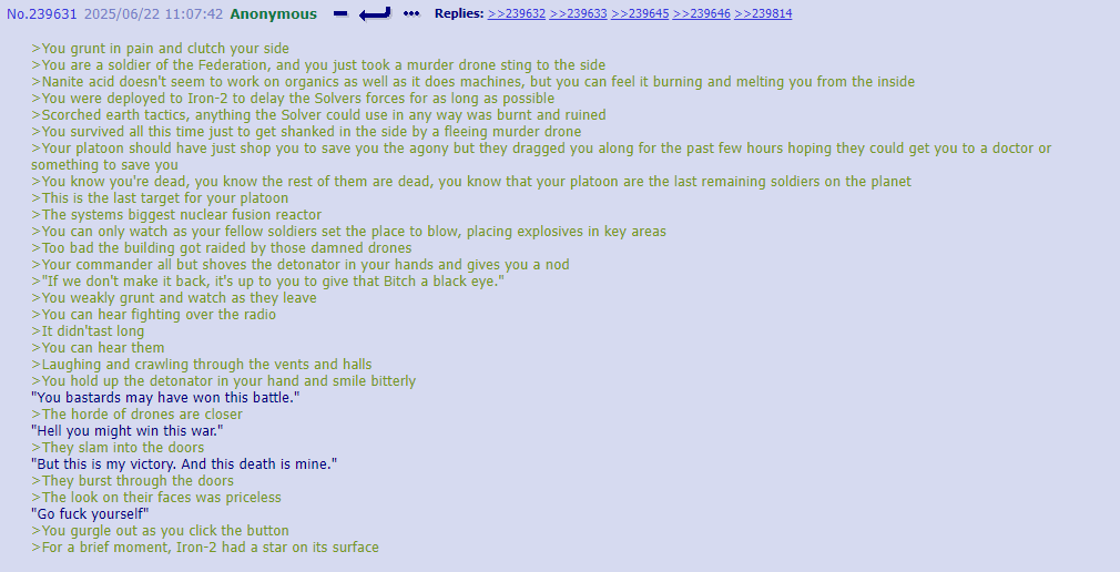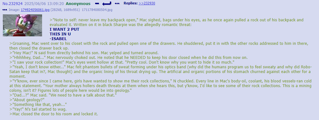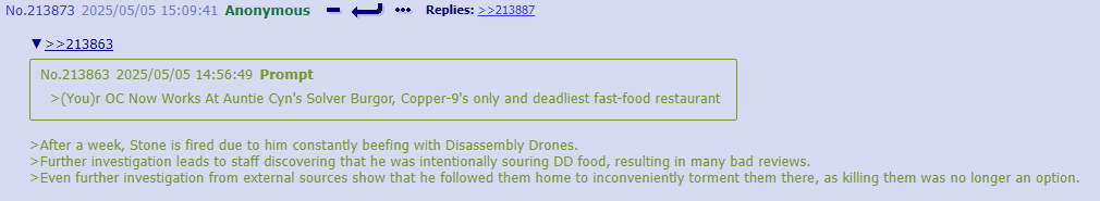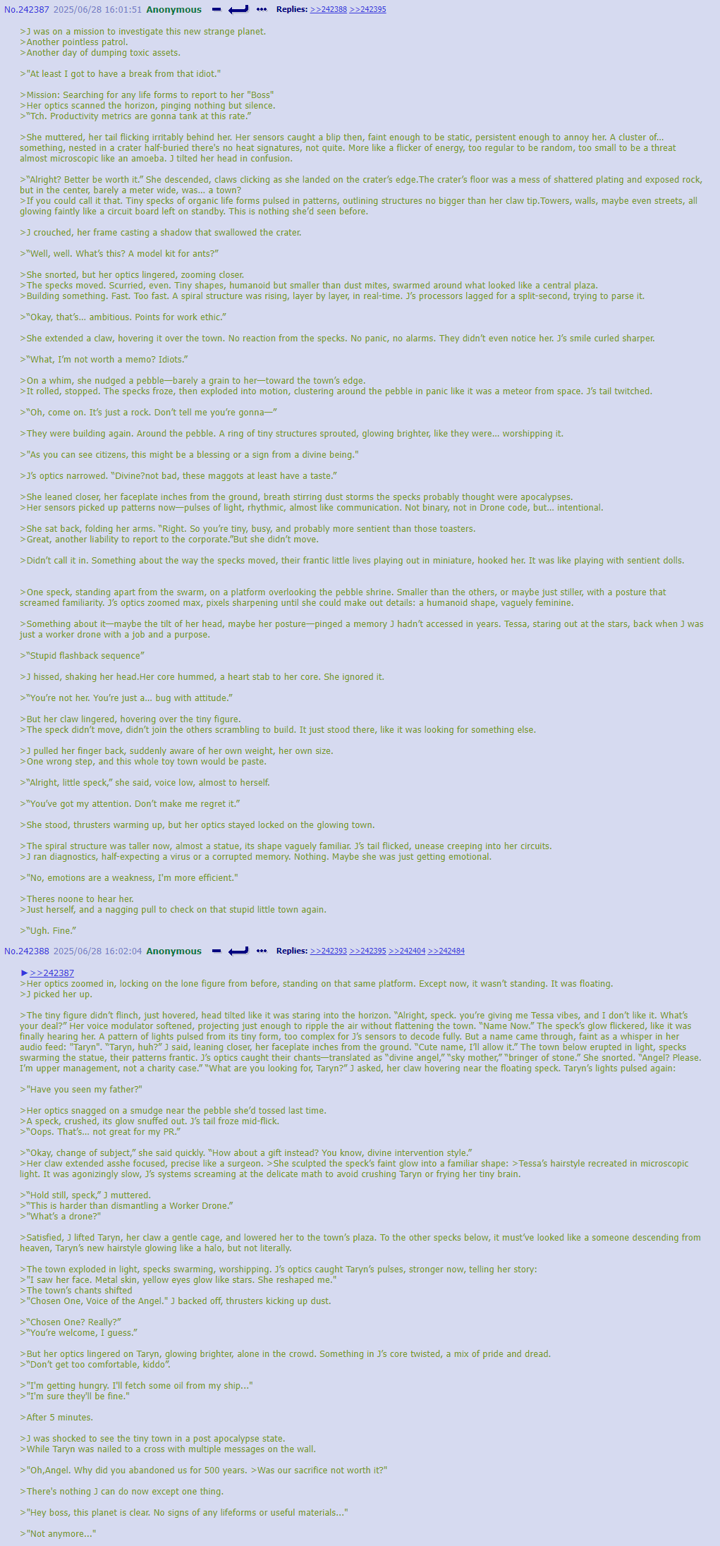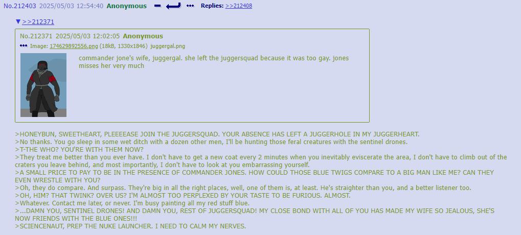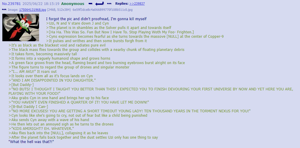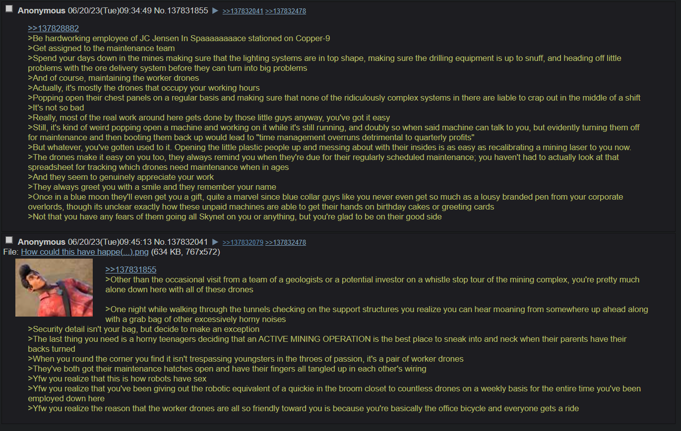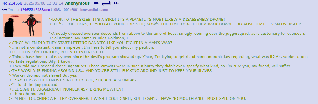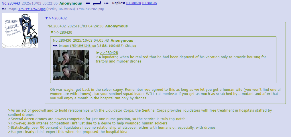 >Fun Nighttime OC Facts: Post-Good Ending, JCJensen once again has a presence on Copper-9. Except not really, since the real one dissolved somewhere around the time humanity was reduced to refugee fleets who are moving in the opposite direction from Copper-9 to this day and a relict population living on the Dog Planet. It's a small (for now...) group consisting of J and a few dozen drones who wanted a free high quality pen and/or a share of any potential get-rich-quick scheme money and/or to join a cult. >It is starting to expand beyond Outpost 3. Robo-God help us all.