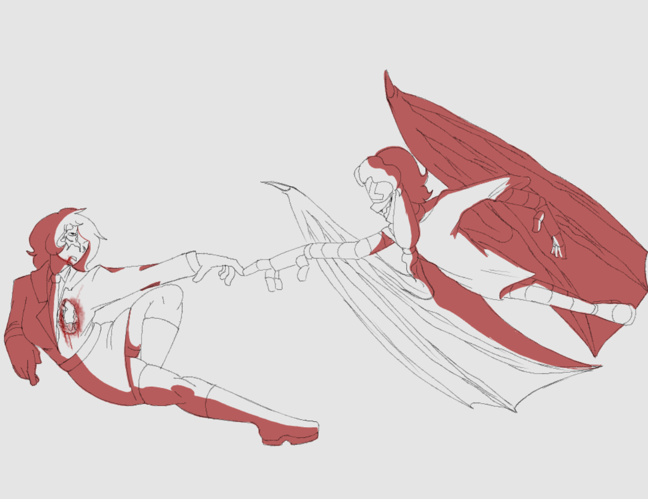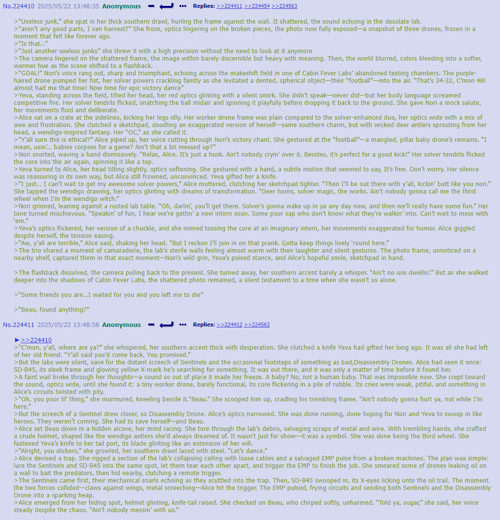 >“Fb…?” >Yet beneath the distortion was recognition, pleading. >She pushed herself up from the ruins of her fallen dance partner, her once-flowing dress torn and stained. Her frame was no longer that of a worker drone—her limbs extended, segmented, and monstrous.