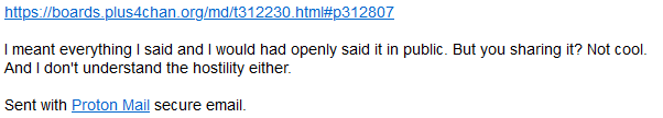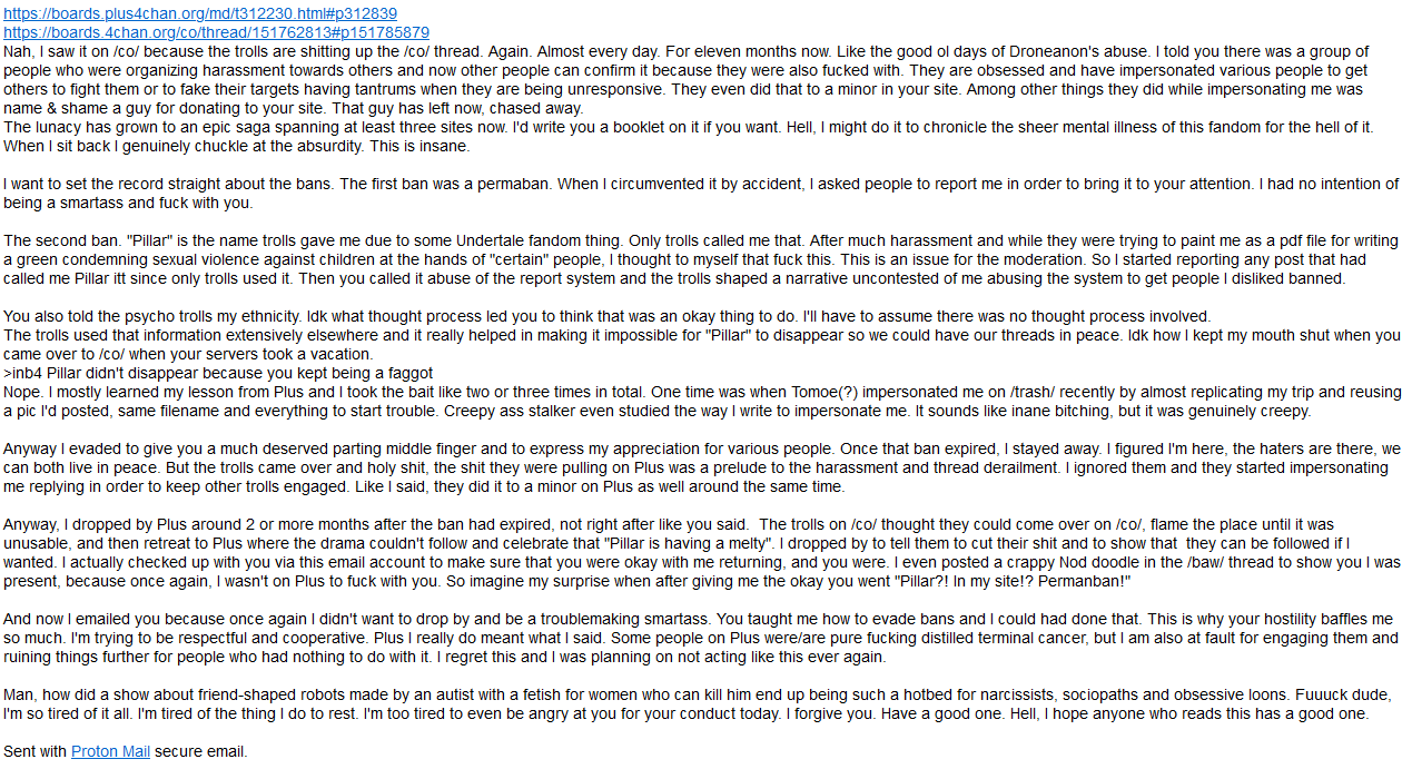 >>313053 I didn't read the entire thing yet but this is from pillar, he is talking about people he said conspired against him. This group is possibly just one person which is referred to as tomoetomoe or just tomoe and he has indeed created a record of falseflagging, attacking anons and drawfags (mostly offsite because I feel he may be afraid to try these schemes here) and being an absolute pest to threads and boards, going unnoticed for a long time until an artist named bunny exposes his actions with a screenshot from a drawpile event where he wanted others to help him play 'thread villains' to mess with pillar. That's the basic gist of the people (or in truth likely one guy) he is accusing, many here have an issue with tomoe I assume but only you can see IDs here so you know. Pillar (sender of the mail) is telling things to you from his view in there, I don't know the traffic between you andhim, I know the things you banned him for on this site here were his fault, but the issue with tomoe is real. Pillar says he doesn't understand 'your hostility' but doesn't ask to be unbanned as far as I see