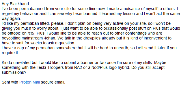 But it turns out the protonmail address he used was in the system somewhere, and it was indeed pillar. Just for the record, the ban notes in the system about him include: >do not post that shit here (the post said "You call that worms? Ha." so I'm gonna guess it wasn't pretty) >abusing the report system, flamewars, 2nd strike >ban evasion >started shit the second his ban expired, 3rd strike >insufferable cunt, permaban on sight.