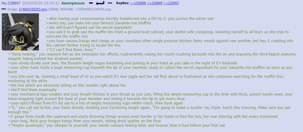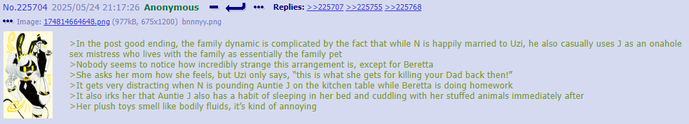>>312569 >Uzi finds out that Doll, due to being assimilated, has been secretly spectating for each & every time the purple gremlin has been clanging N >Even after getting her own body back, Doll has the gall to ask Uzi if she can be invited to join one of these times >Uzi is absolutely livid and accuses Doll of being a shameless pervert who's just wanting an excuse to clang N >Doll clarifies (in a bit too much detail) that she'd be more than willing to focus on "helping" Uzi get clanged instead