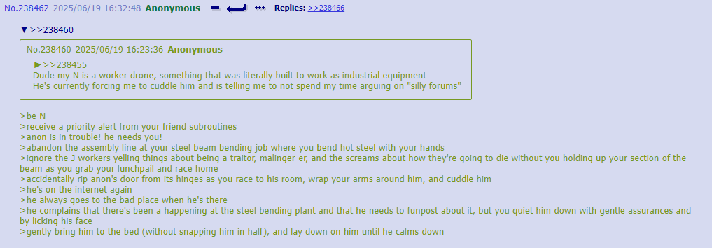 We all post about sexing the drones all the time, but lets be honest none of us could just walk up to a drone and plow it in a dark alleyway. So it's time for real touch starved hours : Imagine brushing hands with a drone