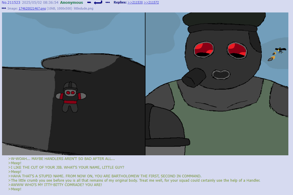 >>312302 Given how dangerous they are perceived to be you can sign a death warrant any time you want and hang out with them. Or maybe you have to specifically be a fodder drone handler in order to hang out with them. At that points it’s cuddles any time you want, they’re desperate for human contact