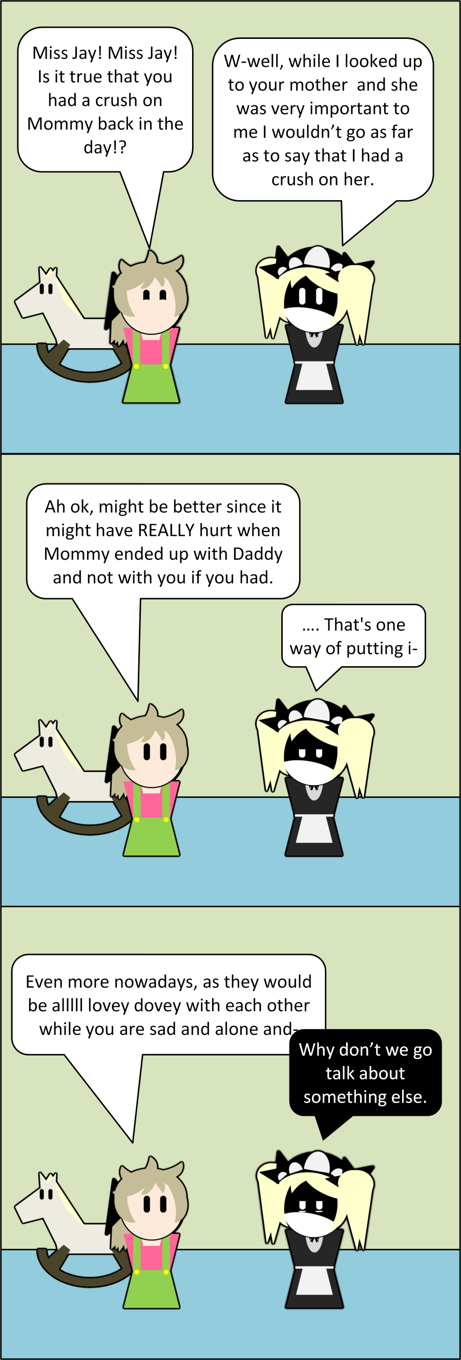 >Nori asks Uzi how big N is >"Uh, I dunno, 5 foot something?" >Uzi thought her mom was asking about N's height >Nori thinks Uzi was talking about N's penis length >Nori keeps scuttling through the vents, 'checking in on her daughter' but secretly trying to get a peek N's supposedly man-sized dong >Nori has no clue what sex is supposed to be like and had Uzi after codesharing with Khan during an intense session of holding hands and looking in each others' eyes >Uzi has never got past second base >N's cock is actually far larger and more terrifying than either are prepared for