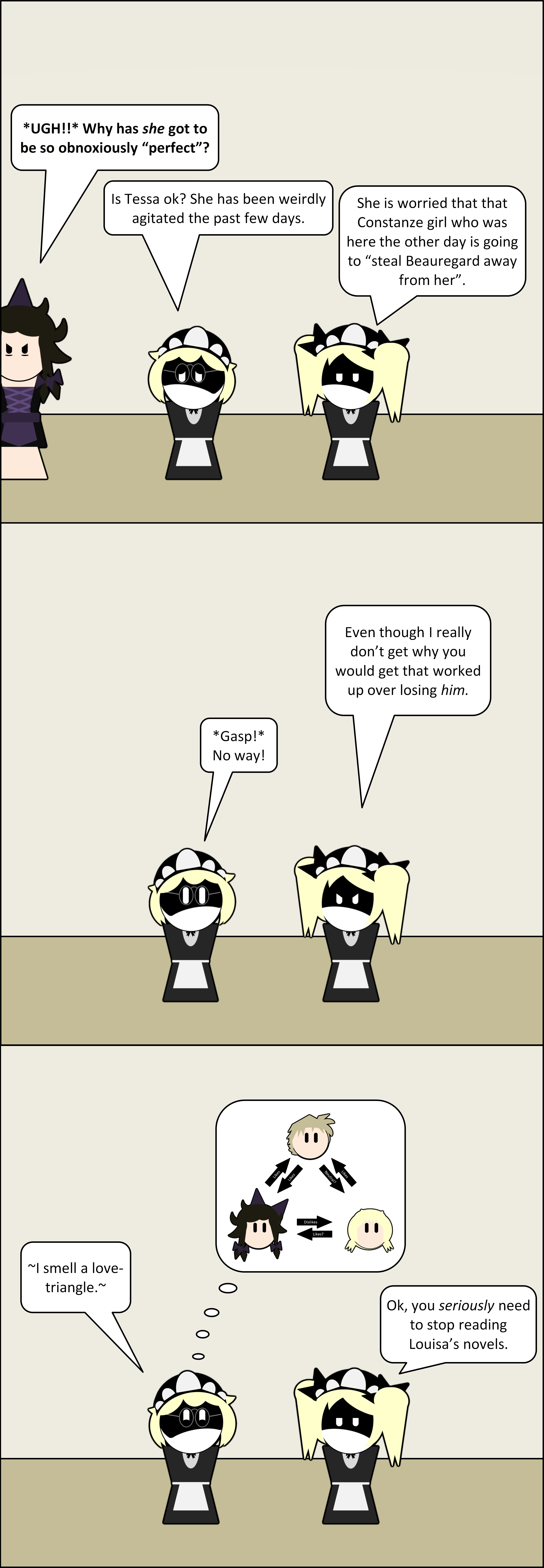 >>316310 More of this stuff, I didn’t want the whole thing to be too one-note, so I put them in a different scenario, plus some backstory for Constanze. Tessa just can’t win.