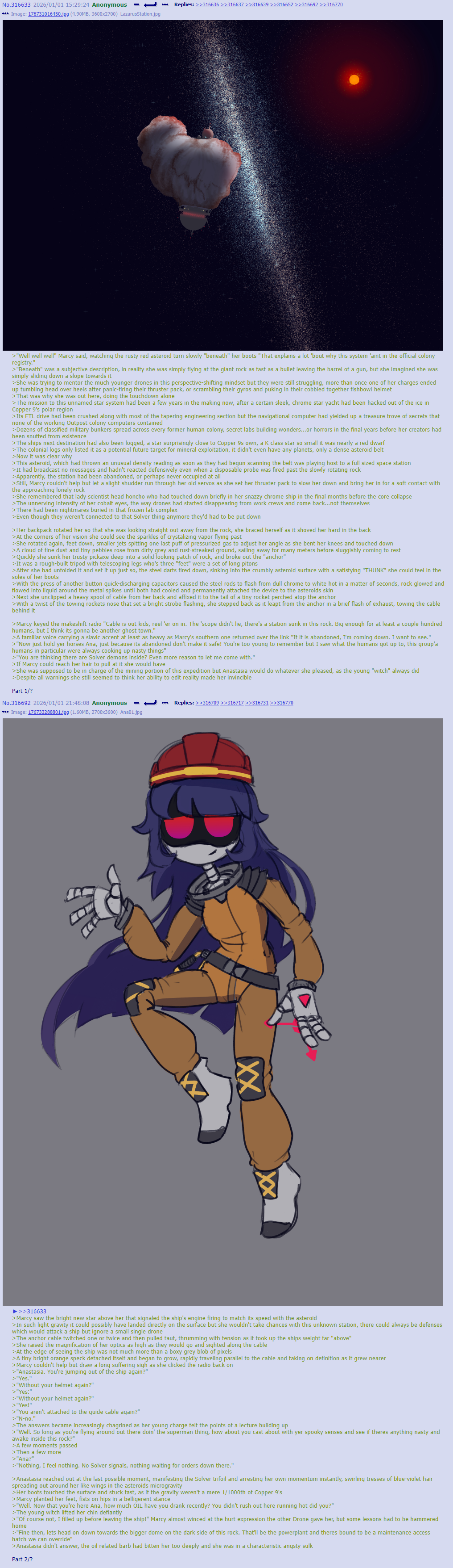 >Anastasia reached out at the last possible moment, manifesting the Solver trifoil and arresting her own momentum instantly, swirling tresses of blue-violet hair spreading out around her like wings in the asteroids microgravity >Her boots touched the surface and stuck fast, as if the gravity weren't a mere 1/1000th of Copper 9's >Marcy planted her feet, fists on hips in a belligerent stance >"Well. Now that you're here Ana, how much OIL have you drank recently? You didn't rush out here running hot did you?" >The young witch lifted her chin defiantly >"Of course not, I filled up before leaving the ship!" Marcy almost winced at the hurt expression the other Drone gave her, but some lessons had to be hammered home >"Fine then, lets head on down towards the bigger dome on the dark side of this rock. That'll be the powerplant and theres bound to be a maintenance access hatch we can override" >Anastasia didn't answer, the oil related barb had bitten her too deeply and she was in a characteristic angsty sulk