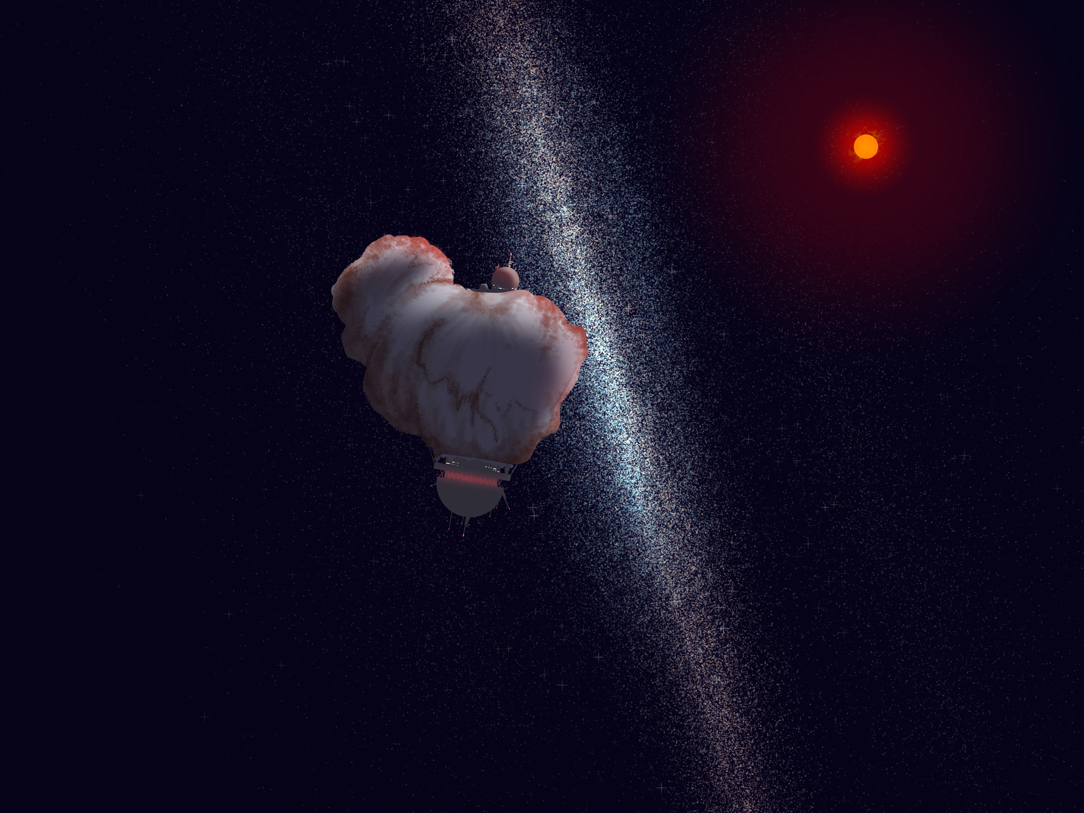 >Her backpack rotated her so that she was looking straight out away from the rock, she braced herself as it shoved her hard in the back >At the corners of her vision she could see the sparkles of crystalizing vapor flying past >She rotated again, feet down, smaller jets spitting one last puff of pressurized gas to adjust her angle as she bent her knees and touched down >A cloud of fine dust and tiny pebbles rose from dirty grey and rust-streaked ground, sailing away for many meters before sluggishly coming to rest >Quickly she sunk her trusty pickaxe deep into a solid looking patch of rock, and broke out the "anchor" >It was a rough-built tripod with telescoping legs who's three "feet" were a set of long pitons >After she had unfolded it and set it up just so, the steel darts fired down, sinking into the crumbly asteroid surface with a satisfying "THUNK" she could feel in the soles of her boots >With the press of another button quick-discharging capacitors caused the steel rods to flash from dull chrome to white hot in a matter of seconds, rock glowed and flowed into liquid around the metal spikes until both had cooled and permanently attached the device to the asteroids skin >Next she unclipped a heavy spool of cable from her back and affixed it to the tail of a tiny rocket perched atop the anchor >With a twist of the towing rockets nose that set a bright strobe flashing, she stepped back as it leapt from the anchor in a brief flash of exhaust, towing the cable behind it
