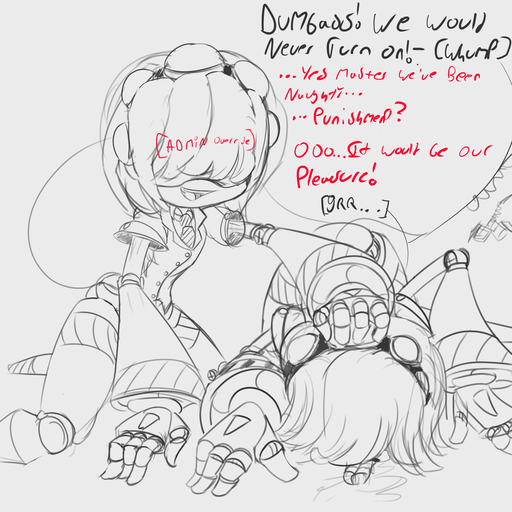 >>316036 >Elf found herself on a slab of concrete >After straining herself too much her body had nearly failed her >She looked up and saw a human >Anon looked at Elf, despite being a normal drone technician his hyper fixation on sentinel drones had paid off. >Elf’s programming compelled her to cover herself. However, despite her chassis’ best efforts her arms and legs wouldn’t budge >Elf’s screen blushed brightly >With a sudden spasm of motion Elf jerked herself away >Anon, didn’t really know what to say or do but he acted anyway. “Elf, you had your right sensor shot through….” >Anon flinched back as a sudden wave of heat hit him and Elf vanished from view >He could smell her electronics burning up >Before he could drench her in cool oil, Elf’s Vail had failed >Her claws were dug into the concrete and her somehow functional tail was slowly constricting itself on some jutting rebar >”No! Get away from me or I’ll cut you with my tail” Elf’s eyes were hollow; she had pulled herself away from anon. >Avre emerged from her dugout >She pushed Anon aside and stepped forward >Her stress lines had almost burned themselves into her monitor >”Elf, Anon doesn’t bite” A pure yet forced smile formed on the surface of Avre’s mouth. >”And if he does, we’ll make sure he won’t be able to again. :>” >The surrounding humans made way for the drone as she went straight for anon >Anon grasped in pain as Avre punched him >Elf’s eyes were hollowed but she couldn’t stop herself from chuckling. A small smile was quick suppressed by her > Her head was tilted away from the others >”that shows him…” shame she couldn’t do it herself >Elf gulped as her eyes closed. She tried to dig her claws further, but her body was too weak >Deep down she had feared it would come to this. >All that time preparing for the perfect moment to strike >All the effort making sure she wouldn’t be expecting a thing >Only for the death of the last thing standing between her and real freedom >To hinge on a human tending to her most intimate parts >Elf diverted all the power she could to any system but her sensors >Despite this she looked straight at Anon as she spoke >”Go ahead”