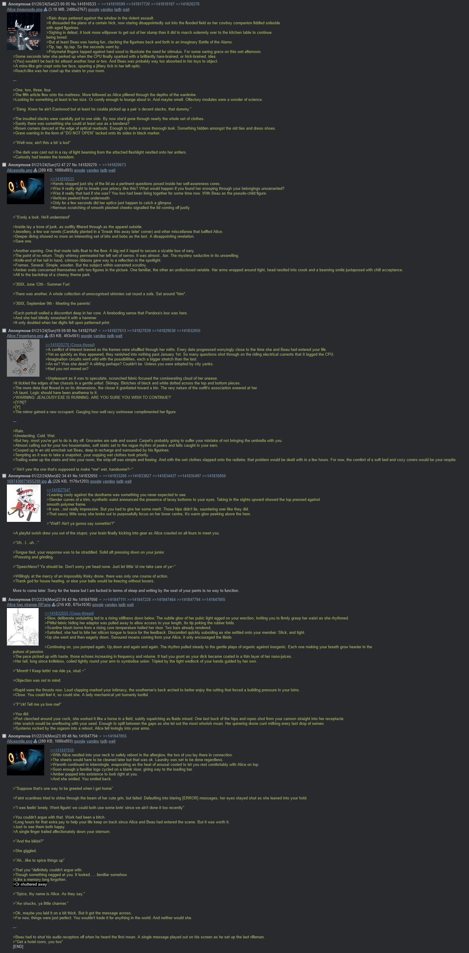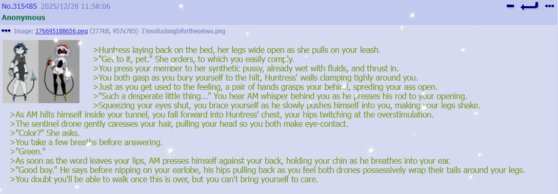 >>318653 Kek, when I wrote this green, I didn't even know such a thing as ntr existed. I just wanted to write about sentinel drones that dominate human.