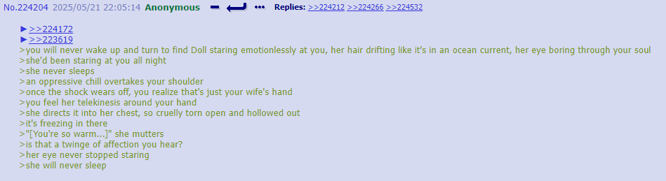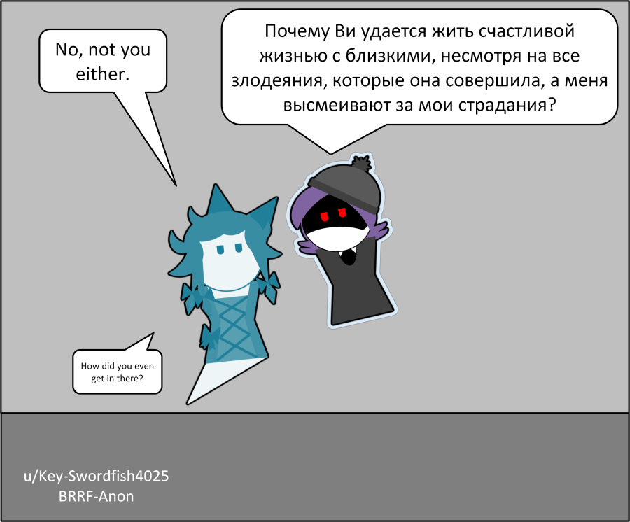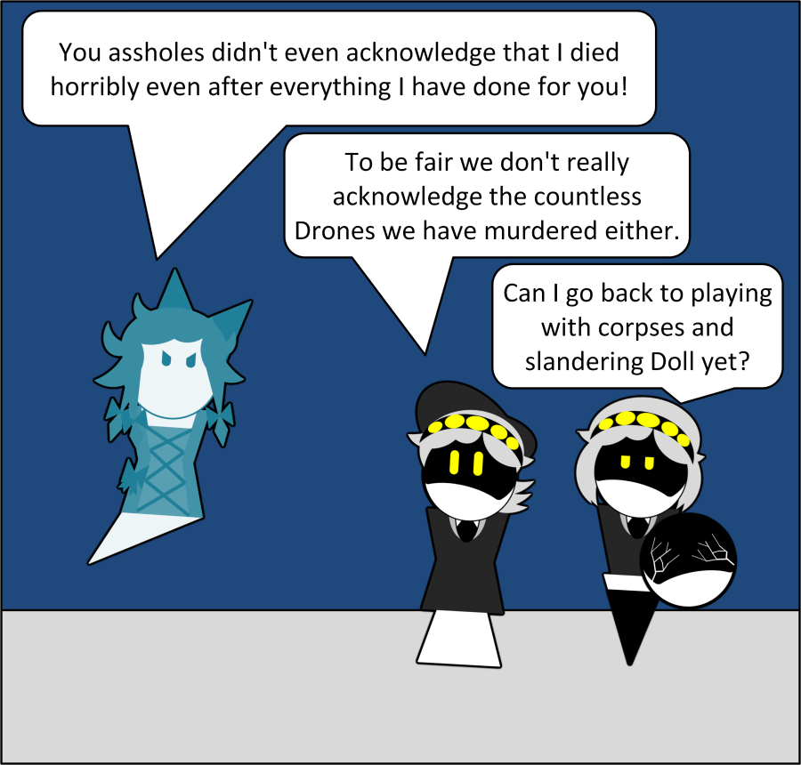 >>318268 Doll says: Why does V get to live a happy life with loved ones in spite of all the atrocities she has committed while I get to be ridiculed for my suffering?