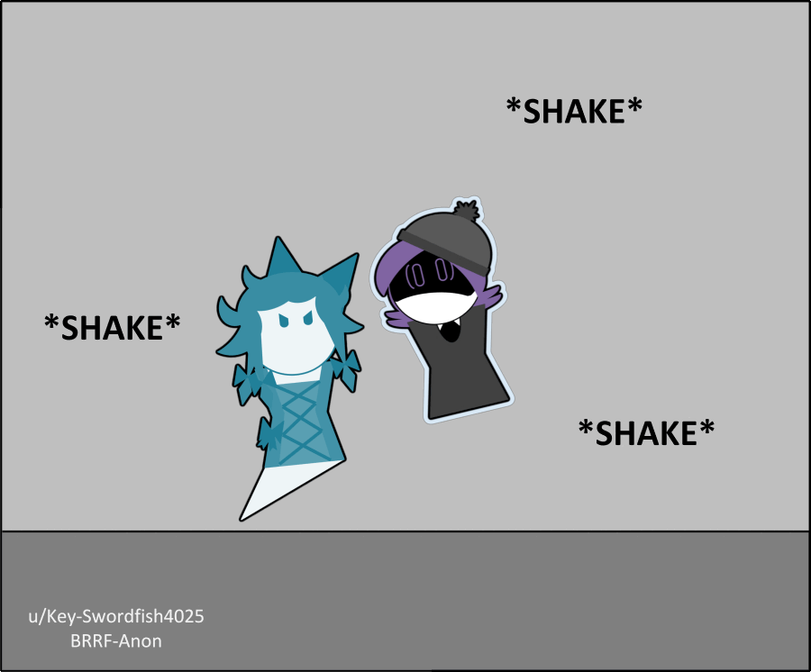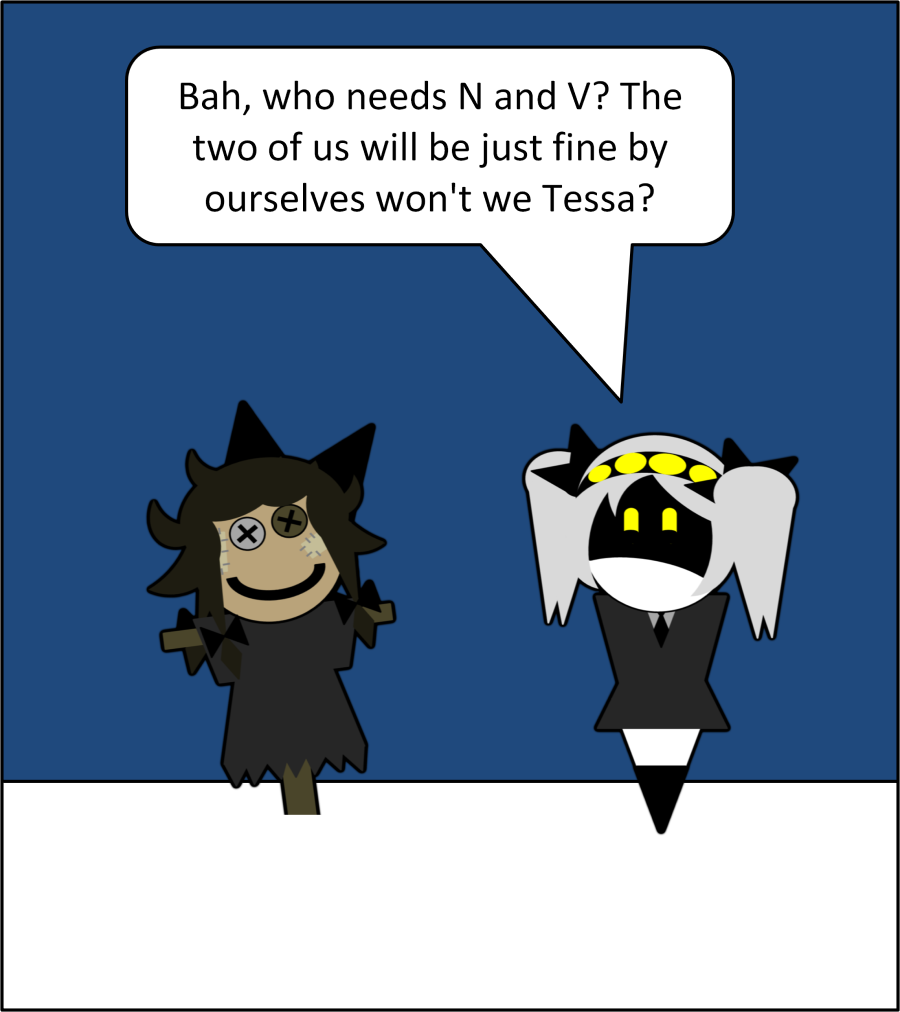 >From behind a rock, invisible to them, Uzi teleported in, stifled a laugh, and vanished before V could spin around. V glared suspiciously but knew Uzi was behind this somehow. Lizzy cackled.