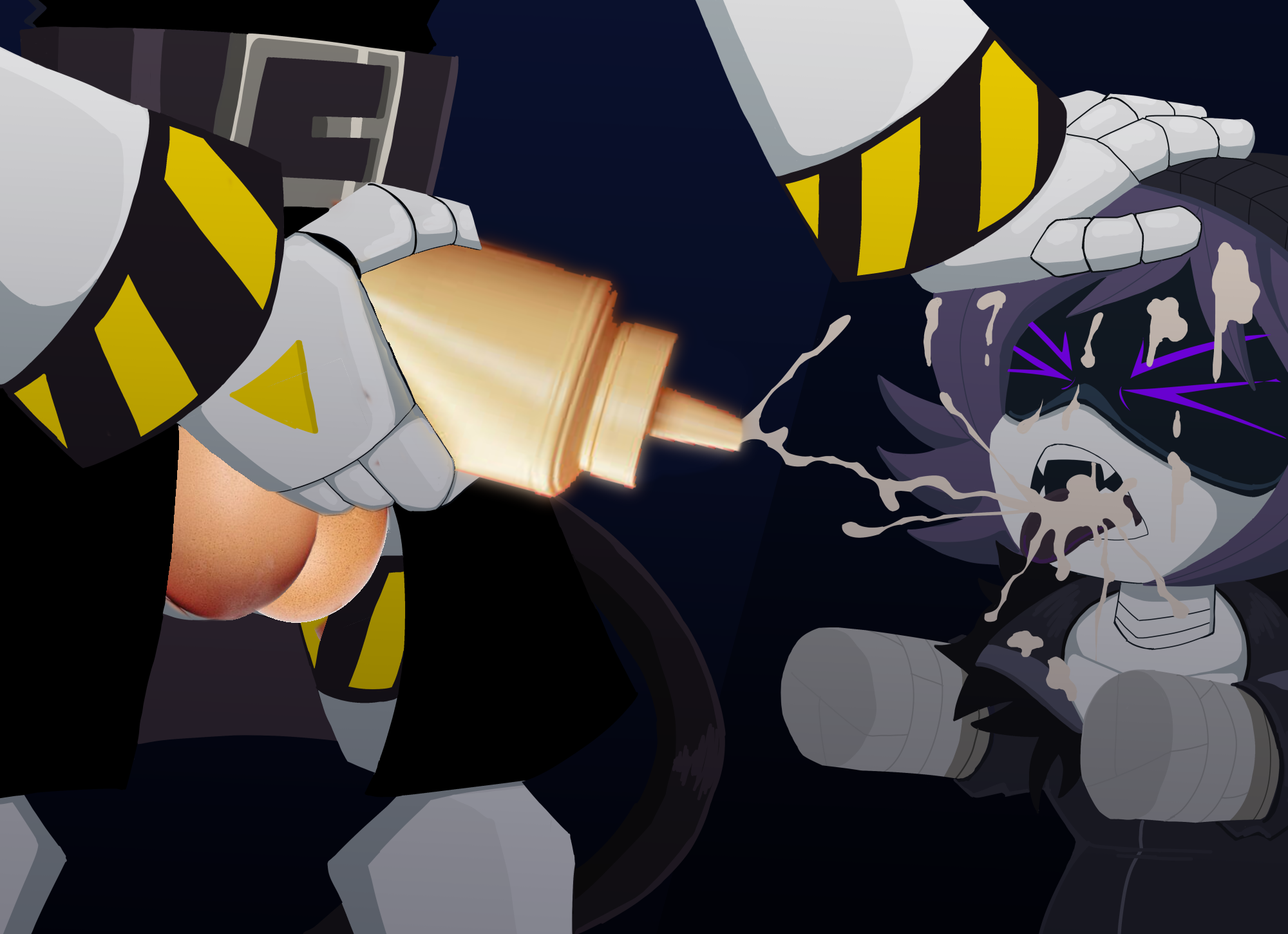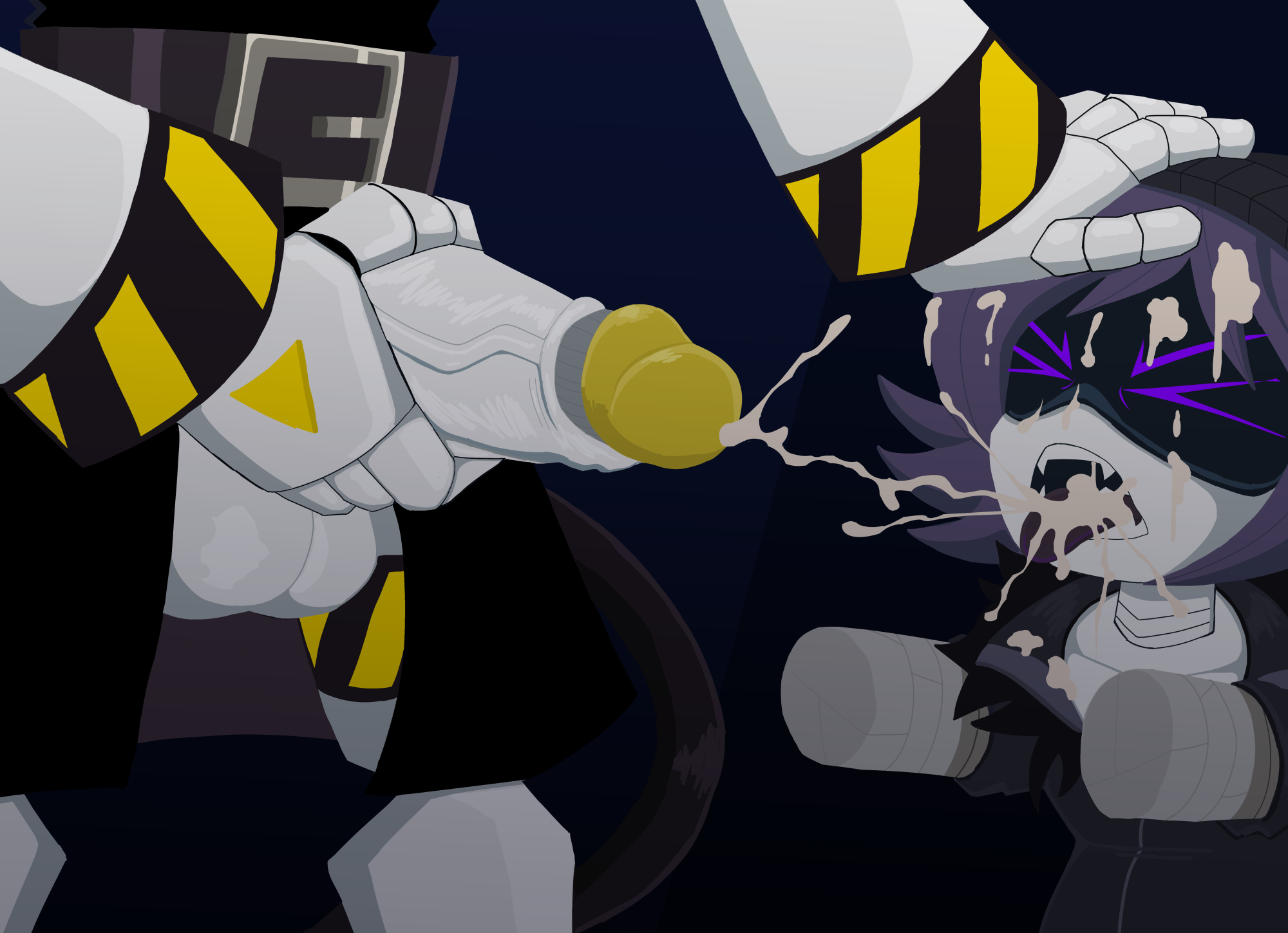 >Suddenly, V's acid tail vial "mysteriously" unscrewed itself and dumped all over her lap. She yelped, jumping up as the acid sizzled harmlessly on her plating but ruined her vibe.