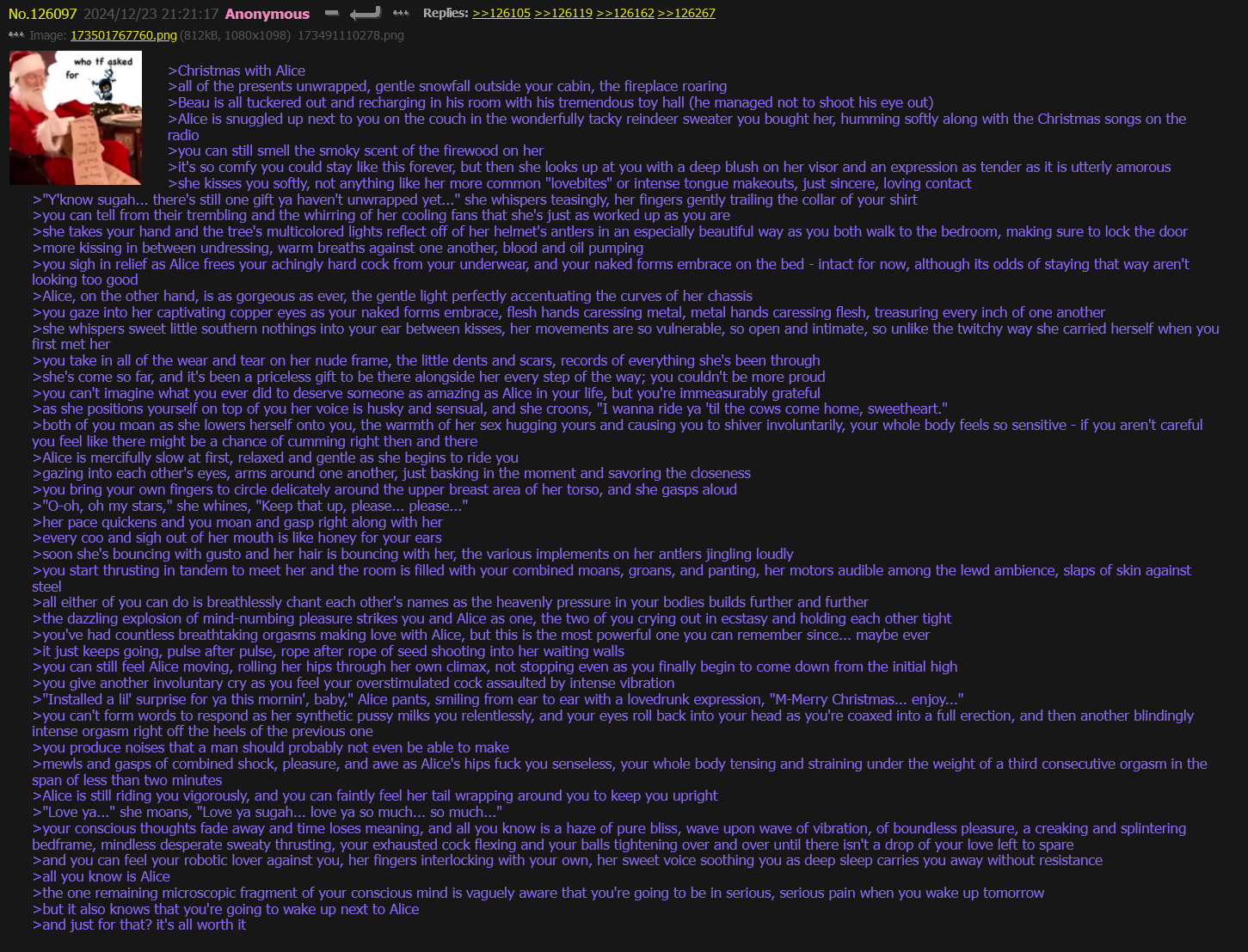 Repostin' this WIP from the previous thread. This will be my first full week back to work under a changed schedule, I am expecting a heavier workload and more overtime days so while I will be richer in the wallet I expect to be poorer in free time for hobbies. I will try to update the Marcy, Holly and Predator/Prey stories as often as I have energy. I would wish all of you Anons an interesting new year but that shit already happened while I was asleep so instead I'll just wish we all have a better year of Drone autism and however many more this fandom has in it after that.
