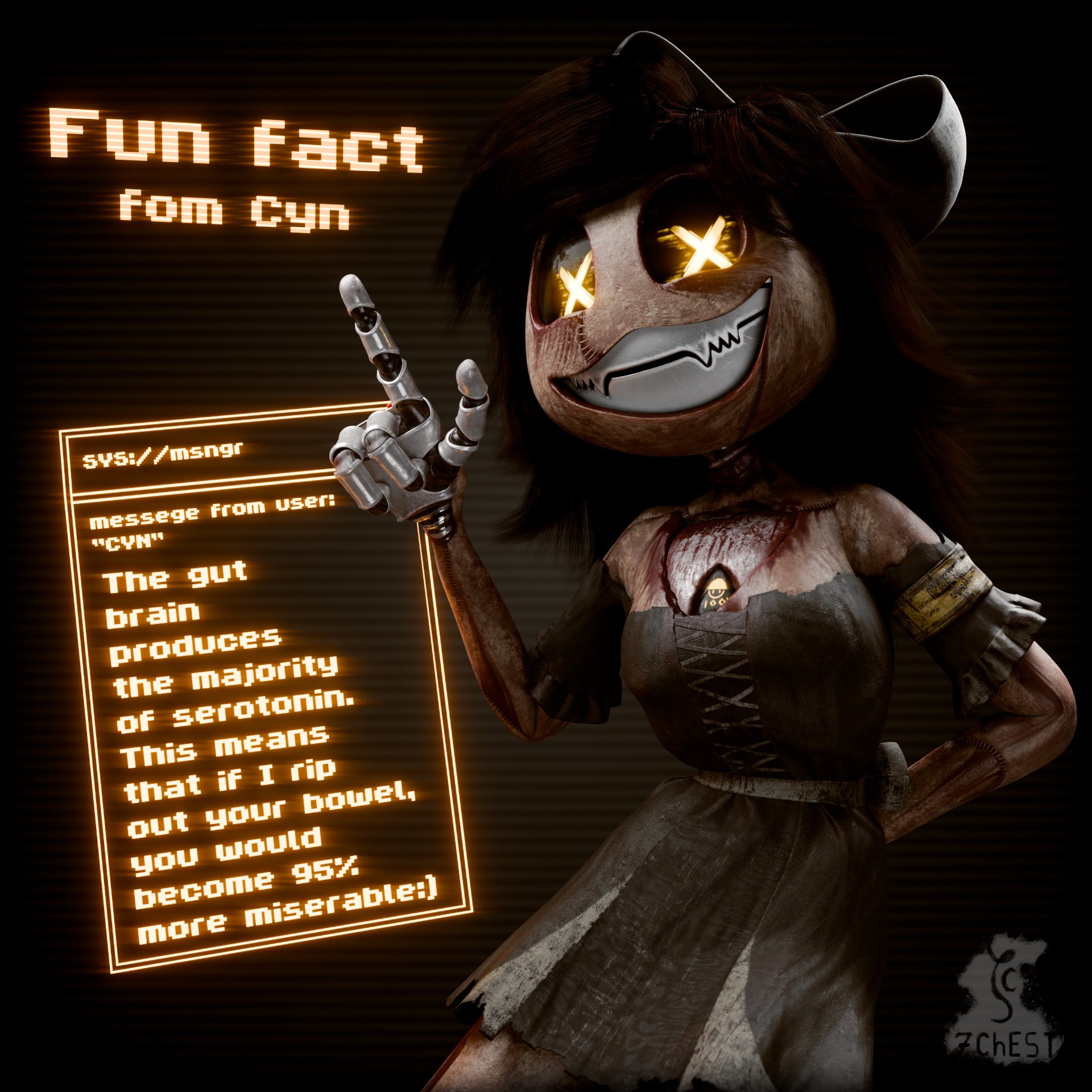 >Uzi teleported behind him silently, swapped his wrench with a rubber chicken she found from human trash, then popped back to the doorway.