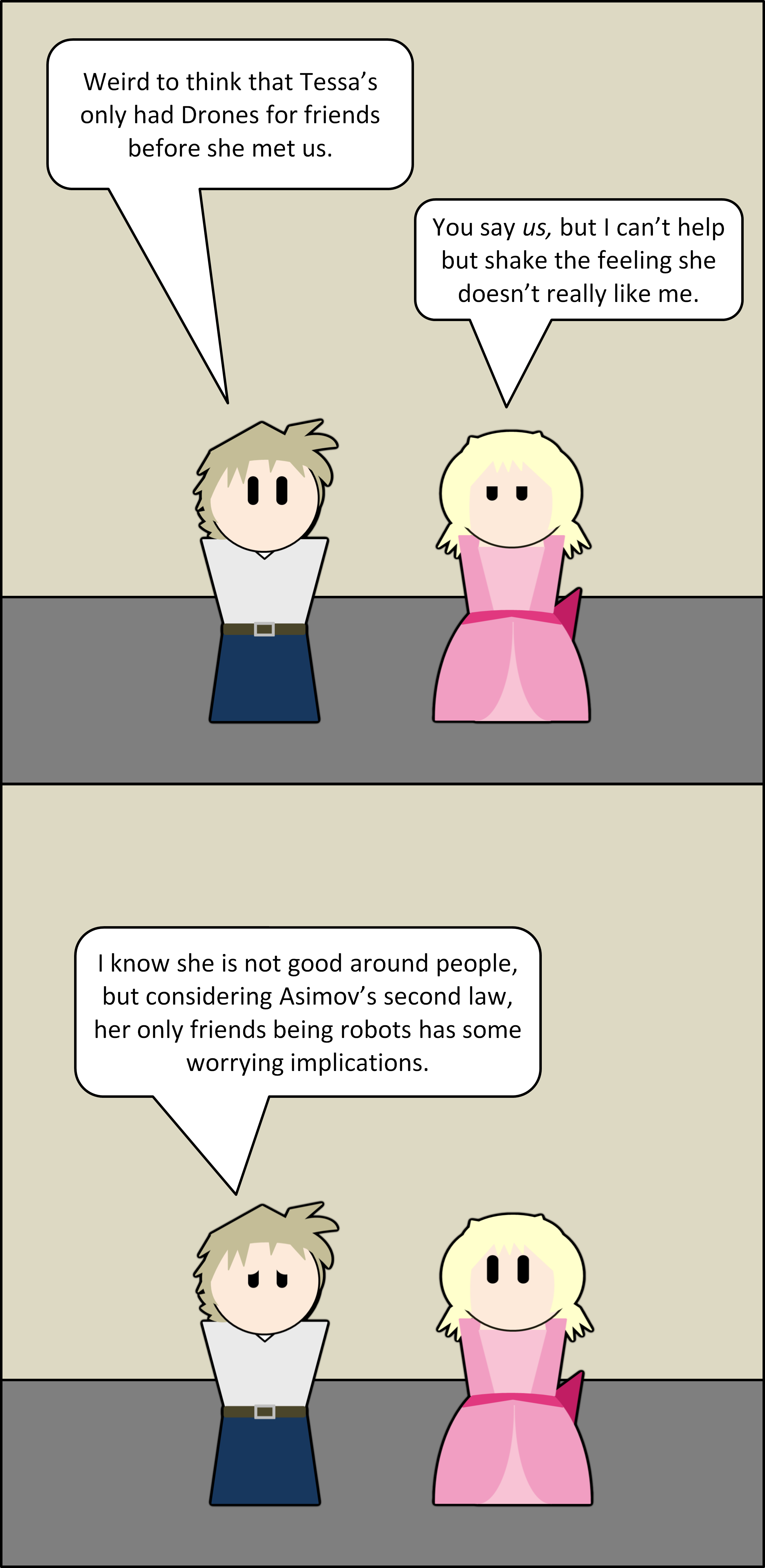 I was thinking of this kind of exchange for some time but I couldn’t find the right scenario for it. I hope the execution went well, considering he is supposed to come across as concerned for her, not condescending or afraid. He is most certainly not aware of Zombie Drones having lost most of their failsaves. On the other hand, none of them seemed to really acknowledge Tessa’s gruesome fate in canon unless you want to REALLY read into one or two of J’s lines.