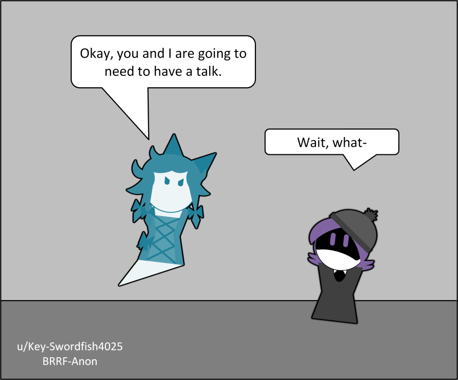 >>317880 >Uzi rubbed her visor where the punch had landed, glaring up at... herself. >The other Uzi stood there, arms crossed, purple eyes narrowed in fury. >She looked identical...same goth hoodie, same edgy hair. >But there was something off.
