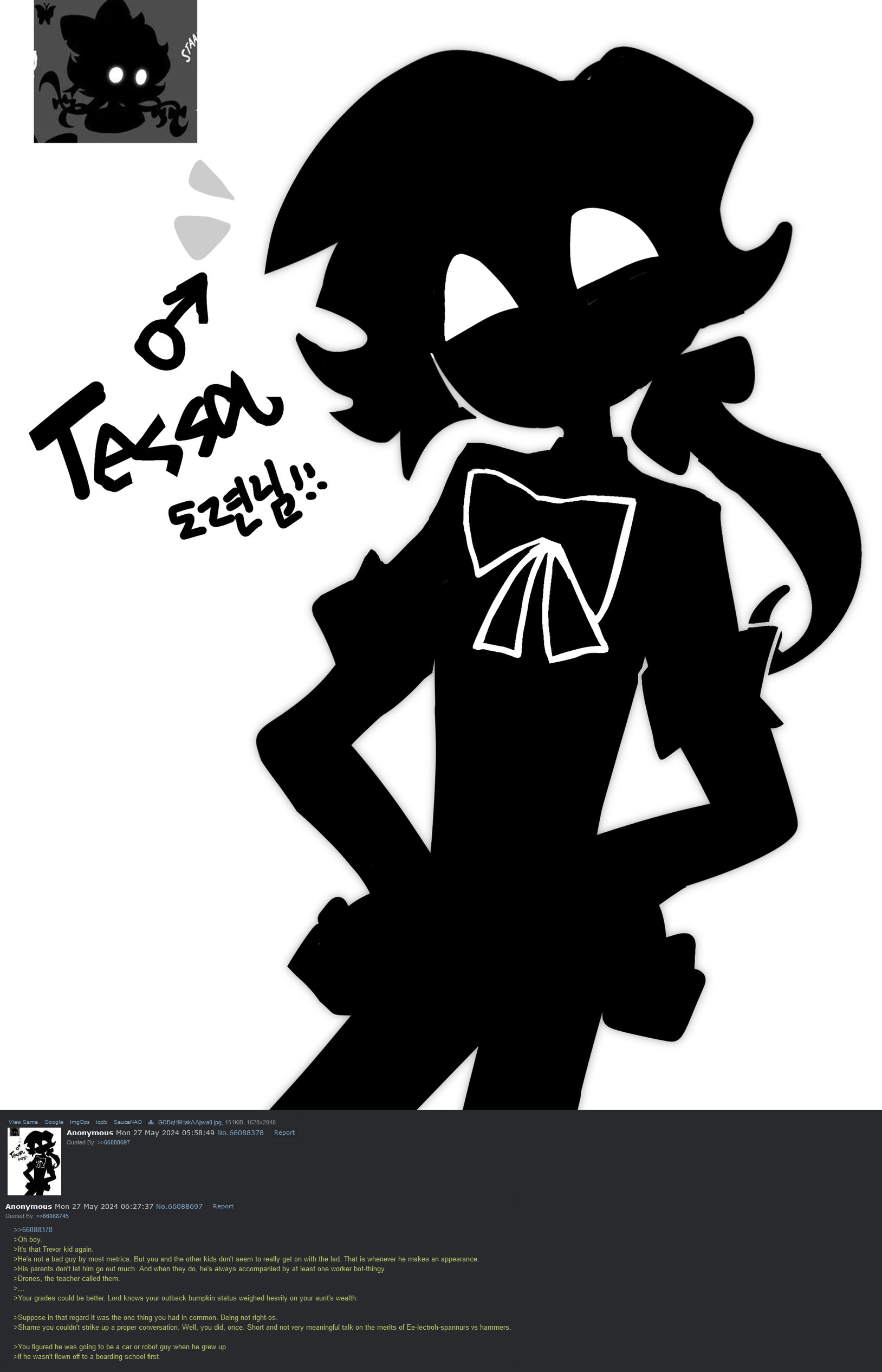 >>318305 >The shadows draw in to emphasise the cold, white orbs staring back at you from the abyss. >Unblinking and unnerving. >*CLICK!* >"So do you wanna come down for tea? Mum had the servants make lasagna tonight." >Perhaps it was just you but Tessa had a way of making entrances. Chalk it up to her autism or isolation or whatever, but she could be damn creepy when she wanted to be. >Regardless. >Lasagna >"Yeah, let just finish up being balls deep in your robot friend and I'll be down in a sec." >She cutely smiled before snapping back go reality. >"Ok mate just let me-...what?"