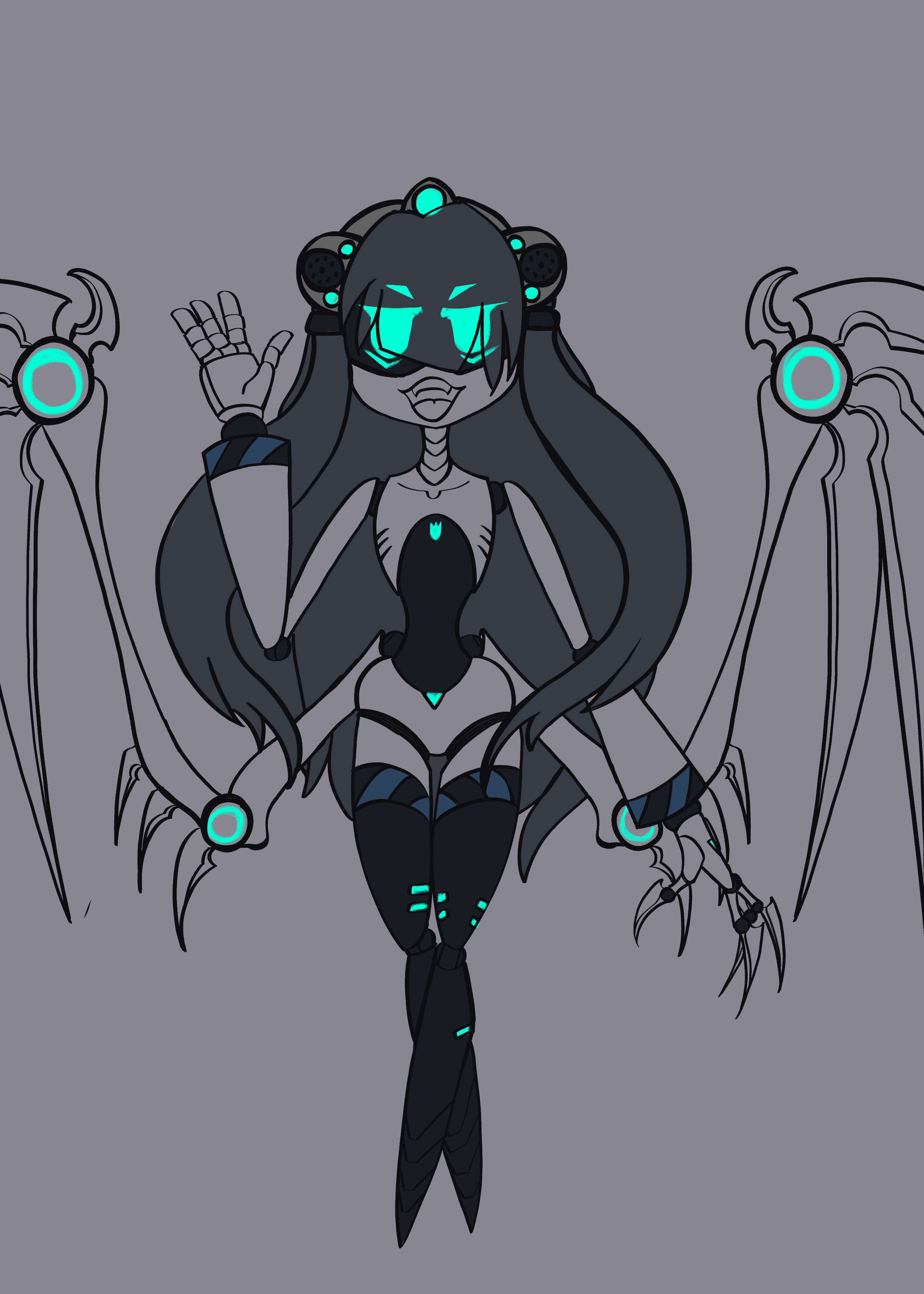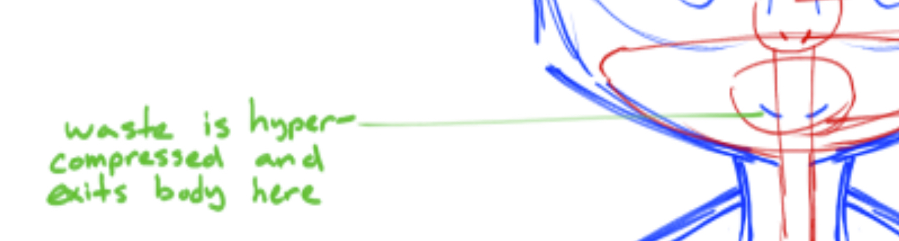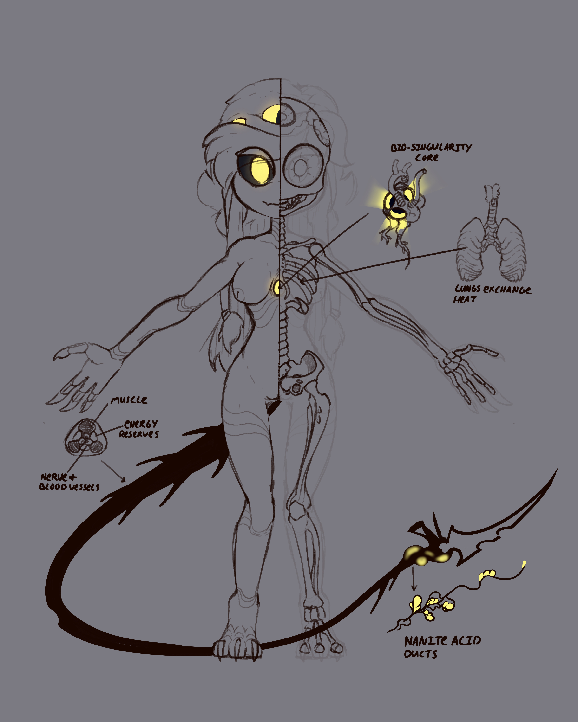 Some basic Anatomy for Maya. As discussed before her body is fueled by a living singularity core. She doesn't have a long digestive system, like a bird she has a sort of crop or gizzard that fills up with stuff she eats, which is then passed directly into her core and converted directly into other chemicals, matter, or energy that her body needs with the only significant waste product being heat. Heat is managed both by blood flow and by breathing. Her lungs exist almost entirely for this task, they are many chambered like a birds as well so that one breath is still passing through the lung as the next breath comes in, so that a constant stream of air is drawing away heat from her body. She doesn't have a liver, kidneys, pancreas or any of the other organs we need for filtering waste or dealing with metabolism or any of that either, the solver core does all that heavy lifting. The space under her ribs but above her hips is entirely filled with a dense rubber foam like material that does nothing but store away extra energy, extra space in her tail is also filled with this material, it serves a purpose basically like fat without taking up the same kind of space, unlike fat it doesn't grow or expand however, it acts like a solid state battery, once it's full of energy potential it's simply full. If necessary Maya can subsist for weeks at a time on this energy store unless she does something extremely taxing that burns through it faster than everyday life. As was probably obvious the set of lumpy growths at the end of her tail are nanite-acid glands, allowing her to deliver a lethal sting exactly like a Disassembly Drone.